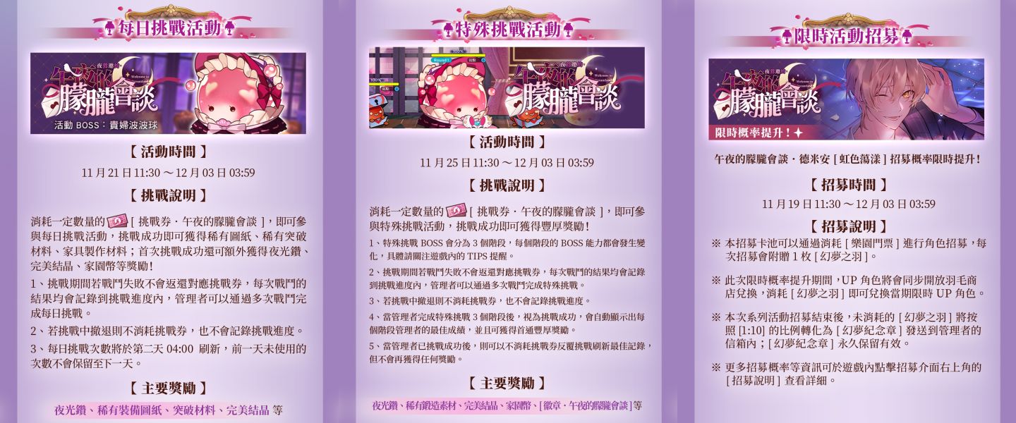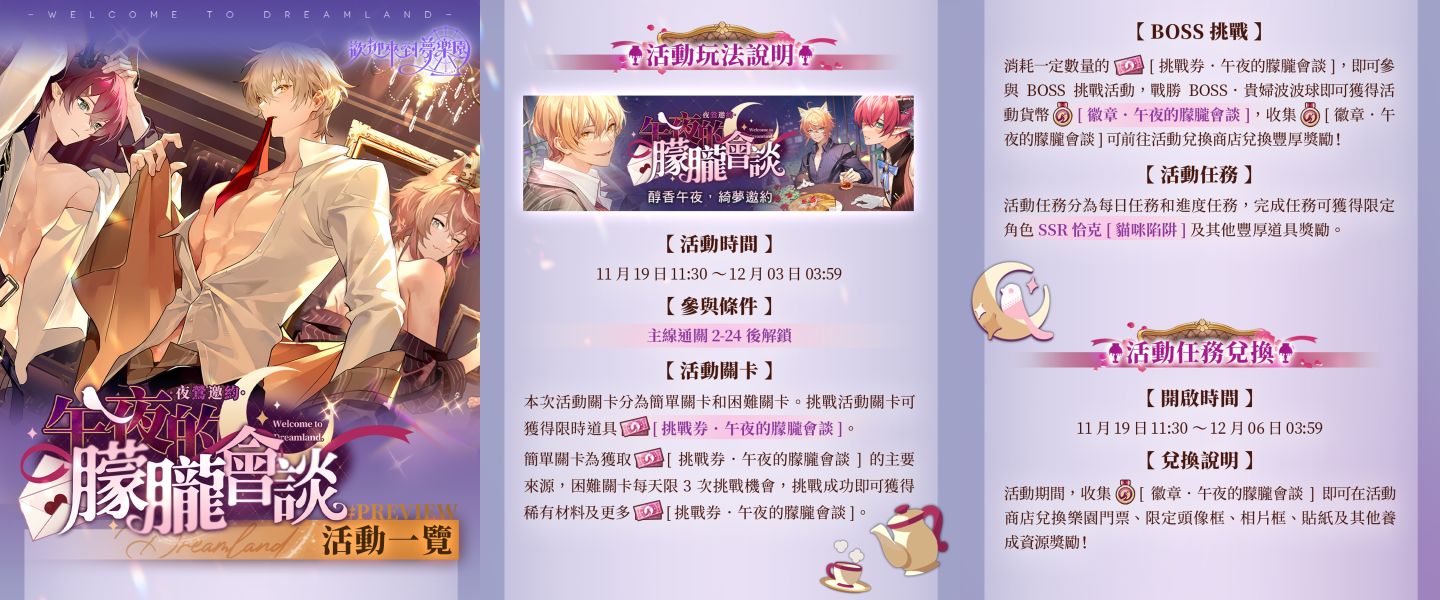 與此同時,也開放玩家挑戰活動關卡,挑戰成功即可獲得「挑戰券.午夜的朦朧會談」以及大量稀有材料,消耗一定數量的挑戰券即可參與 Boss 特殊挑戰活動,戰勝 Boss 再獲得「徽章.午夜的朦朧會談」,可前往活動兌換商店即可兌換樂園門票、限定頭像框、相片框、貼紙及其他養成資源獎勵。完成活動任務還可領取 SSR 角色「恰克・貓咪陷阱」!
