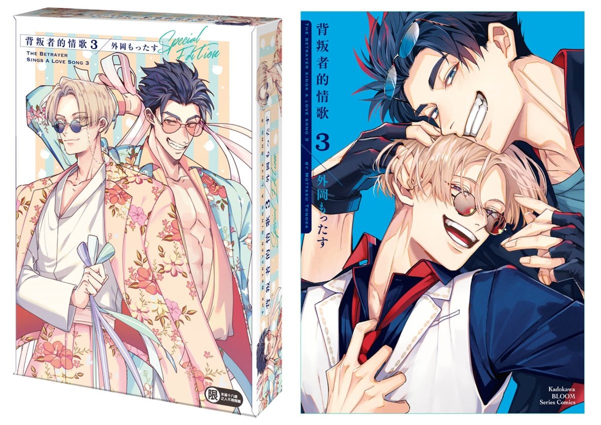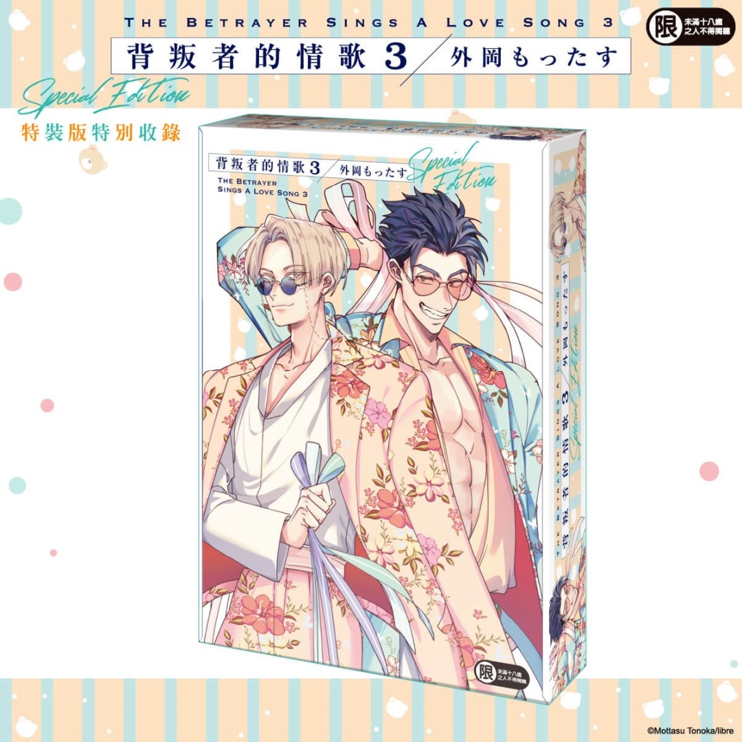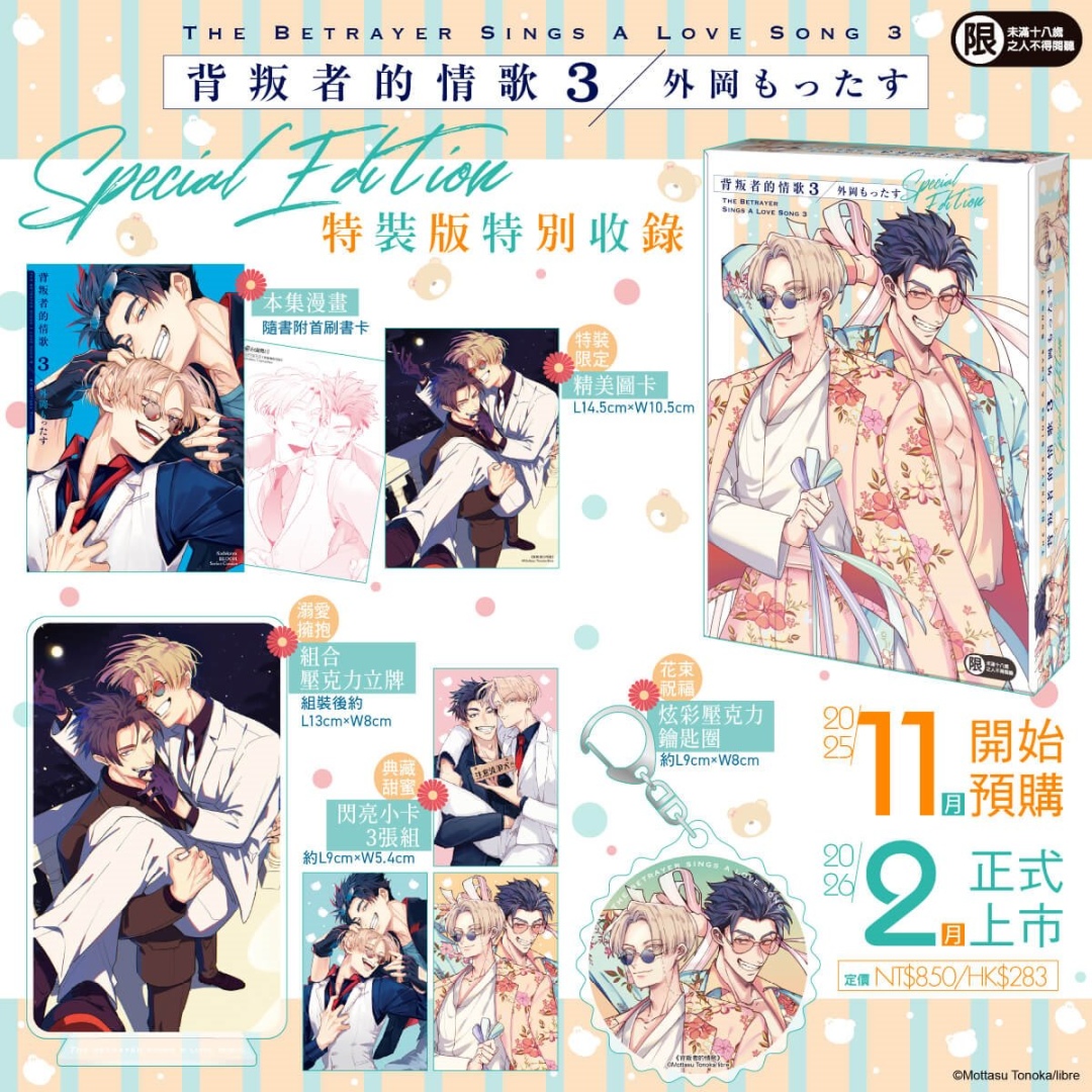 2026台北國際動漫節首賣強作不斷!由日本人氣 BL 漫畫家外岡もったす 創作,講述義大利黑手黨家族敵對首領的戀愛故事《背叛者的情歌》將在台推出第三集特裝版,收錄多款限定周邊,自 11/20 起開放限時事前預購。台灣角川也將於台北動漫節舉辦《背叛者的情歌》特別活動,更多情報將於近期陸續公開!