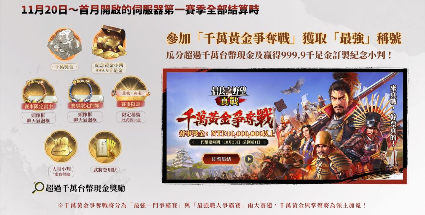 隨著《信長之野望 真戰》正式上線,千萬黃金爭奪戰也正式拉開序幕。本次賽事包括「最強一門爭霸賽」和「最強職人爭霸賽」,挑戰瓜分總獎金 1,000 萬台幣、紀念黃金小判。上線首月的伺服器均能參與到本次賽事中,馬上下載遊戲,一起來爭奪千萬獎勵!除了賽事外,還有豐富的開服福利等著你來!