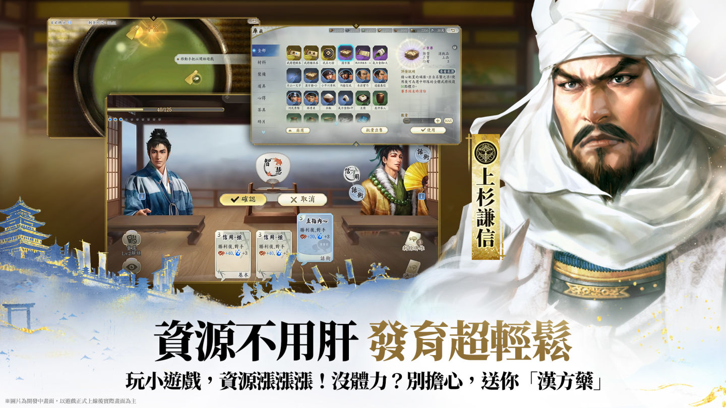 資源爭奪是策略遊戲的一大樂趣!在過往的遊戲中,玩家只能靠攻打有限的資源地獲取資源,但本作新增多元資源提升管道,玩家能從簡單有趣的戰國小遊戲,獲得戰場資源與戰鬥加成等等。還有如回復體力的「漢方藥」,減少玩家重複養成的「無損換將」功能等創新設計,讓玩家能夠從傳統 SLG 無休止的「爆肝」循環中解放出來,實現真正的輕鬆發育。