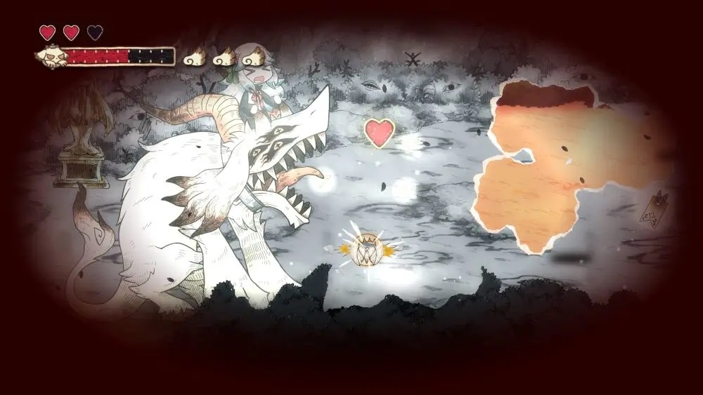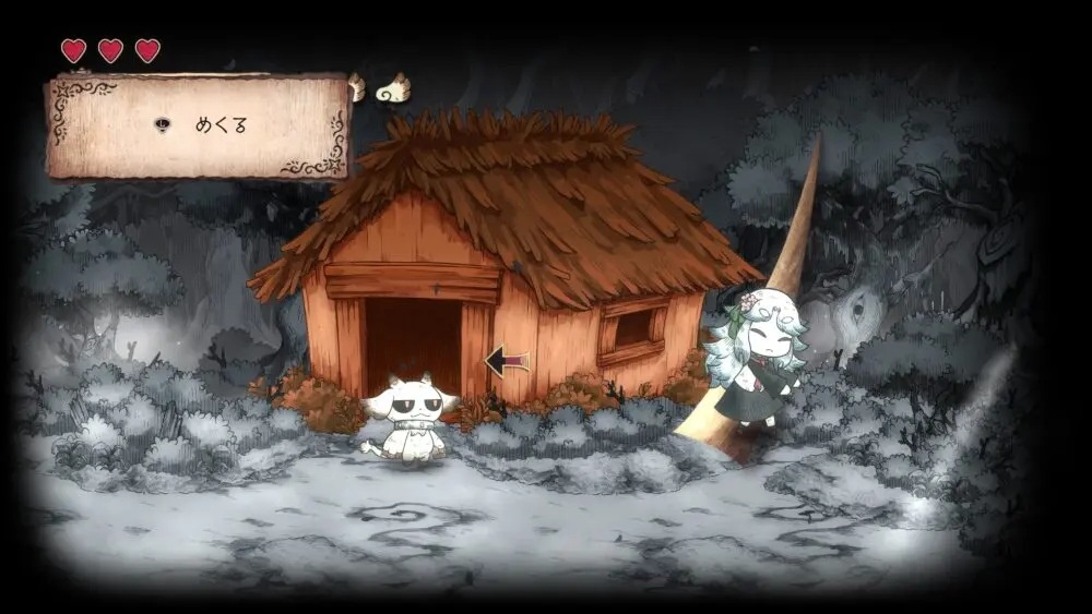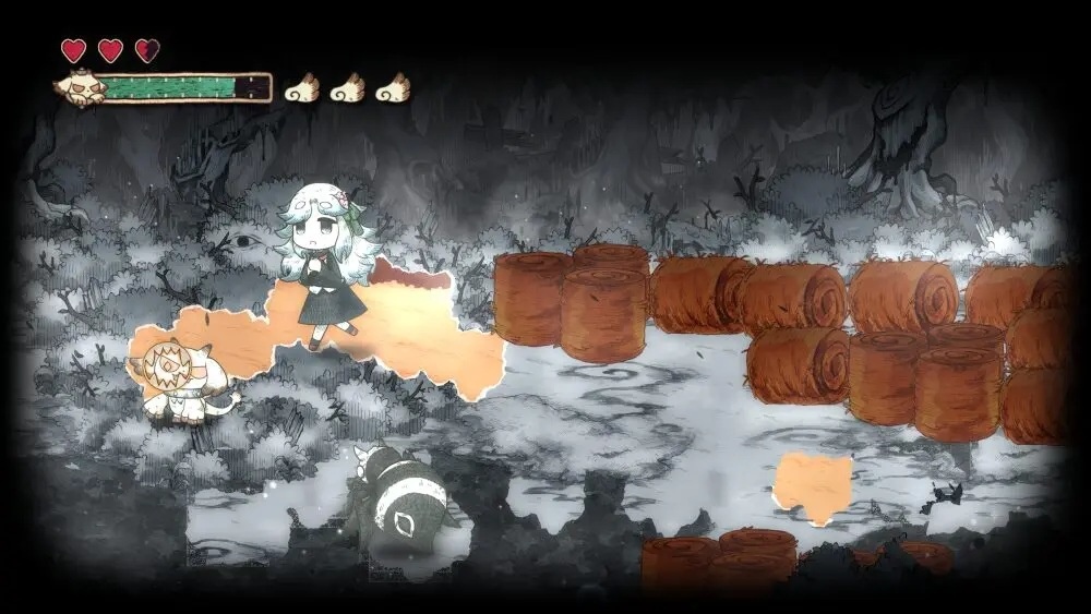 如上所述,本作最大的特色,就在於可以干涉繪本世界的兩個操作玩法。其一就是可以讓作為玩家夥伴登場的怪物「梅爾」(メェル)使用的「食紙」(紙喰い)能力。玩家可以藉由這點,來將立在眼前的樹木岩石、阻擋玩家前進的牆壁等黑白繪製物件全部都給吃掉破壞,藉此來強行開拓前路不斷前進。