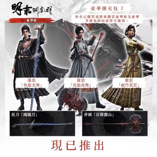 遊戲開發商靈澤科技與全球遊戲發行商 505 Games 正式宣布,《明末:淵虛之羽》的第二波豪華擴充包正式已隨 1.7 版本更新同步上線,為玩家帶來更多全新服裝套裝與武器,同時再贈送額外免費頭飾。
