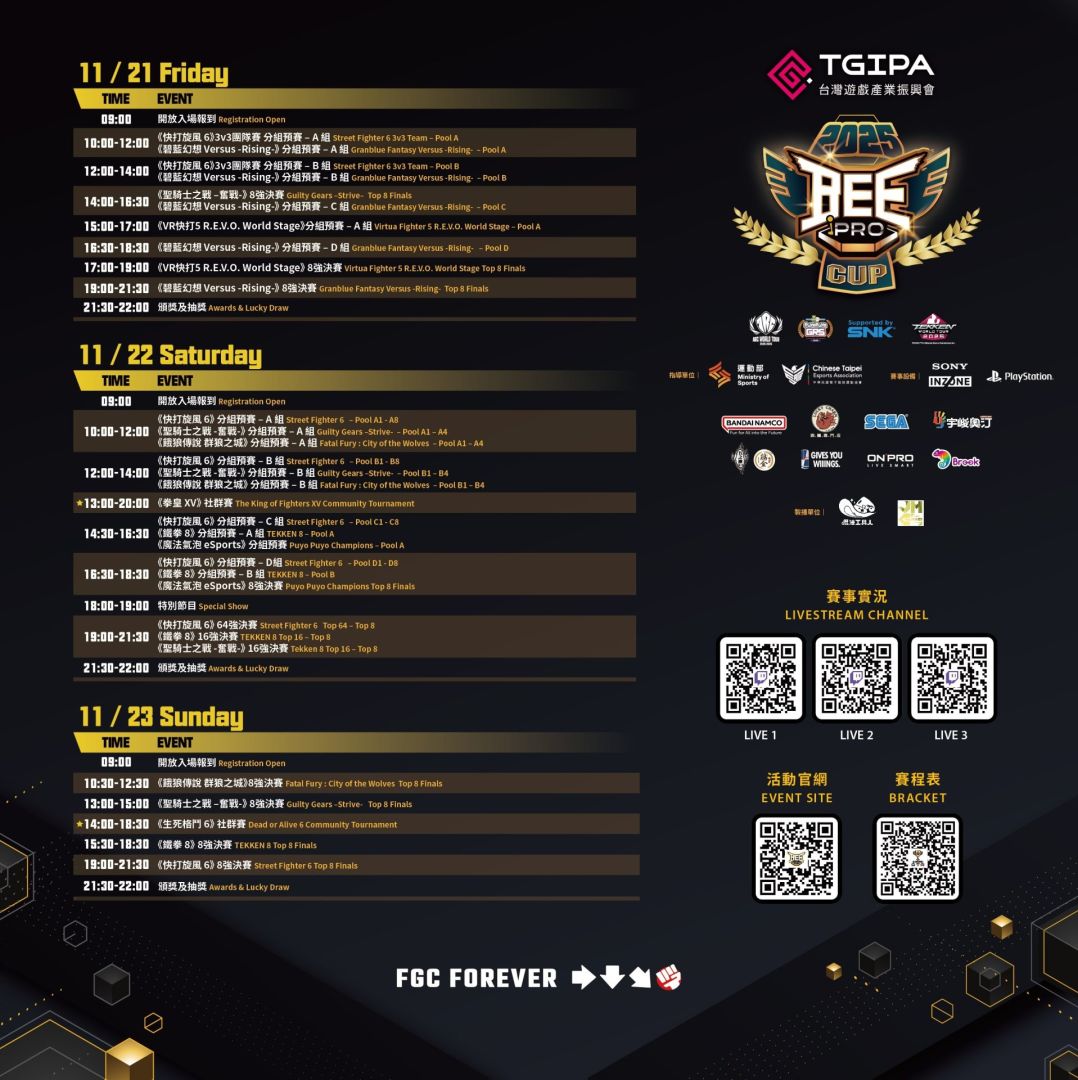 各項賽事決賽將於 11 月 22 日晚上 7 時開始,及 11 月 23 日整日(上午 10 時至晚上 10 時)進行,歡迎蒞臨採訪,感受格鬥遊戲的熱血並見證世界高手的對決。
