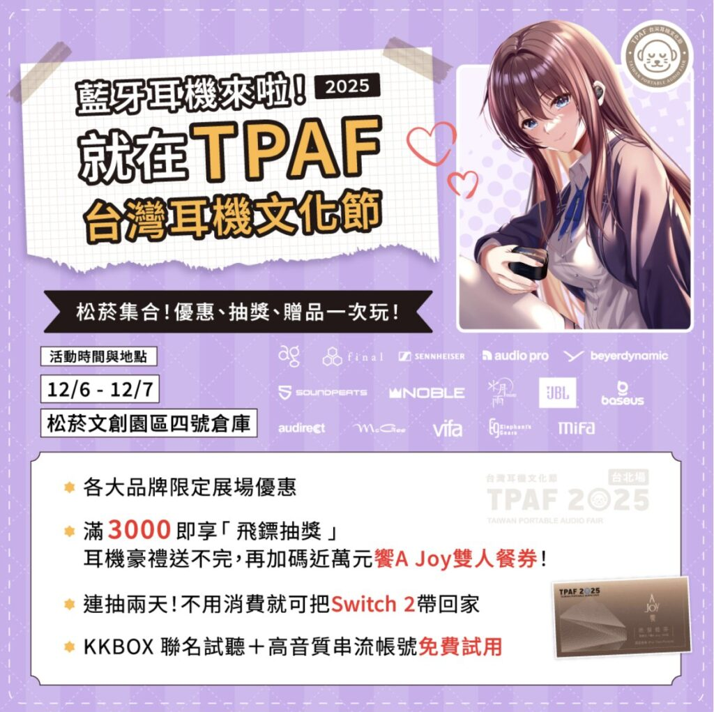 由中華民國台灣耳機協會主辦的年度耳機盛會「TPAF 台灣耳機文化節 2025 台北場」,將於 12 月 6 日至 7 日在松山文創園區四號倉庫正式展開。本屆展會除了匯集百大耳機品牌展示最新硬體外,對遊戲玩家矚目亮點在於主辦單位提供任天堂次世代主機 Switch 2 作為每日抽獎豪禮,且主打「免消費、掃碼即抽」對玩家招手。