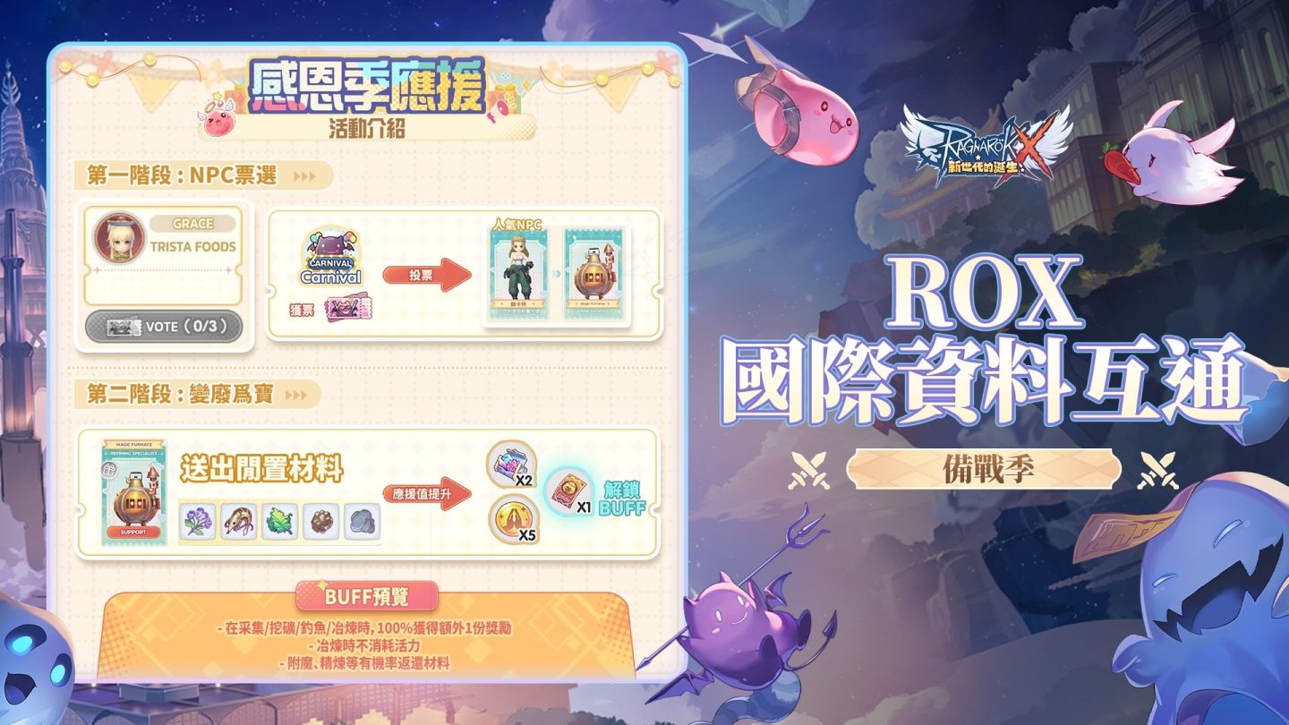 《ROX》史上最強遊戲 Buff 震撼更新!玩家應援 NPC 後即可兌換強力 Buff,Buff 類型豐富多樣,包括冶煉時 100%不消耗活力,採集/採礦/釣魚/冶煉時 100%額外獲得 1 份獎勵等。這些 Buff 將極大提升玩家在遊戲中的資源獲得效率與操作體驗,幫助玩家更快地提升實力。但需注意,本次活動限時開啟,各位玩家千萬不要錯過這難得的提升機會。