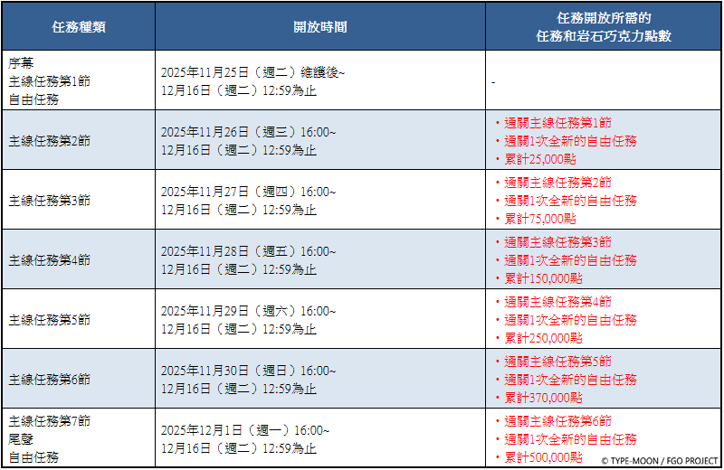 即日起至 12 月 16 日(二)12:59 期間,在「情人節 2025~在巧克力之河的彼端~」中,將逐日開放全新活動劇情的主線任務。活動期間御主挑戰活動任務,蒐集「岩石巧克力點數」達到一定的數量時,不僅可獲得「鎖定巧克力」、「驚喜巧克力」外,還有活動限定指令紋章、傳承結晶及呼符等多項報酬。
