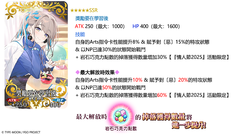 蒐集活動道具「熱融巧克力草莓」、「熱融巧克力棉花糖」、「熱融巧克力餅乾」,可用來兌換活動限定概念禮裝「★5(SSR)獎勵要在學習後」以及多樣豪華獎勵,裝備活動限定概念禮裝後可提升「岩石巧克力點數」的掉落獲得數量,增加御主們的蒐集效率。