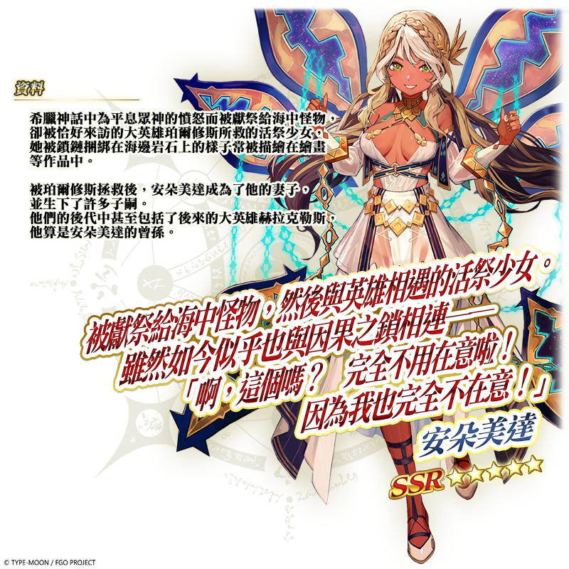 活動期間「★5(SSR)安朵美達」以 Rider 職階現身,透過寶具「沉睡於那片海中的鯨龍」的施展,使敵方全體的防禦力下降及對敵方全體發動強大的攻撃,並賦予技能封印狀態與自身防禦力大幅提升。