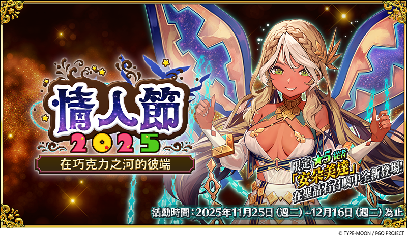 《Fate/Grand Order》繁中版(中文名:命運 - 冠位指定,以下簡稱《FGO》繁中版)於今(25)日舉辦全新情人節活動「情人節 2025~在巧克力之河的彼端~」。