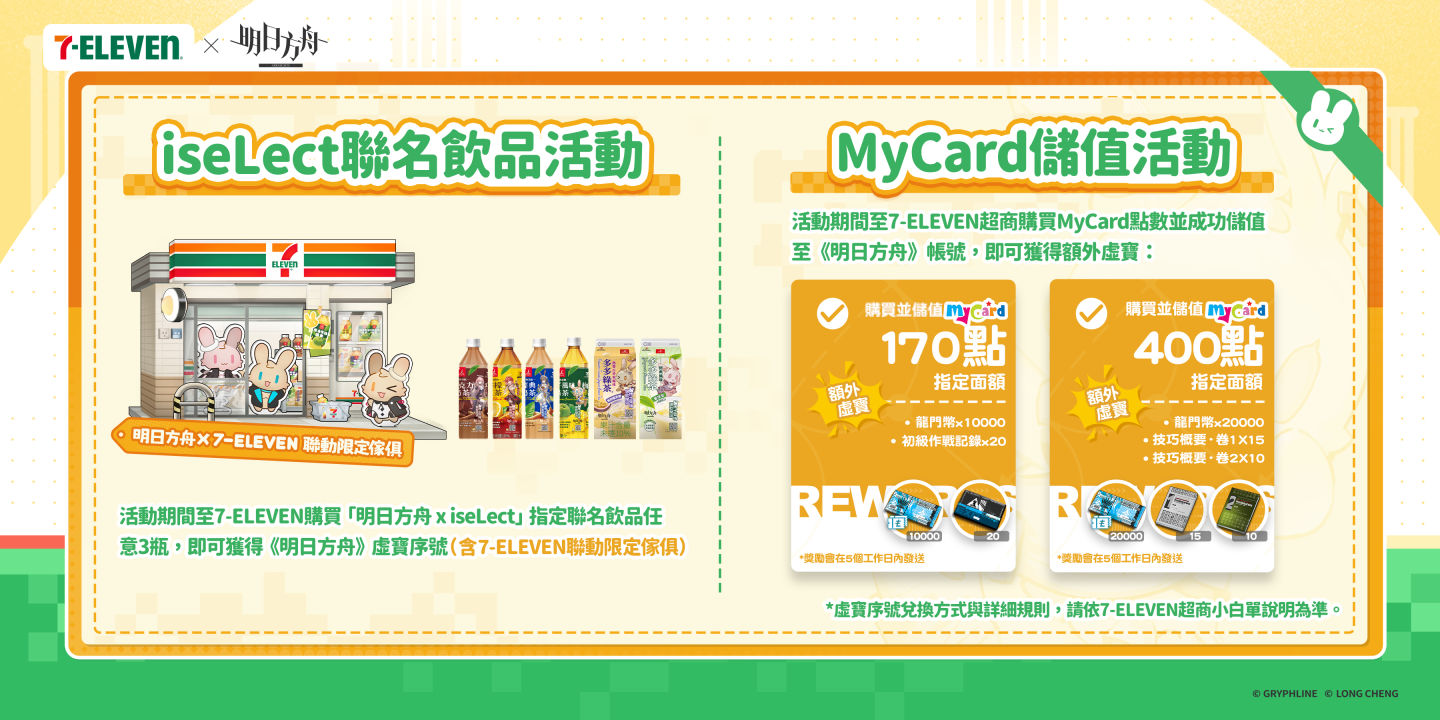 活動期間至 7-ELEVEN 購買 MyCard 指定點數並成功儲值至《明日方舟》帳號即可獲得額外虛寶獎勵。