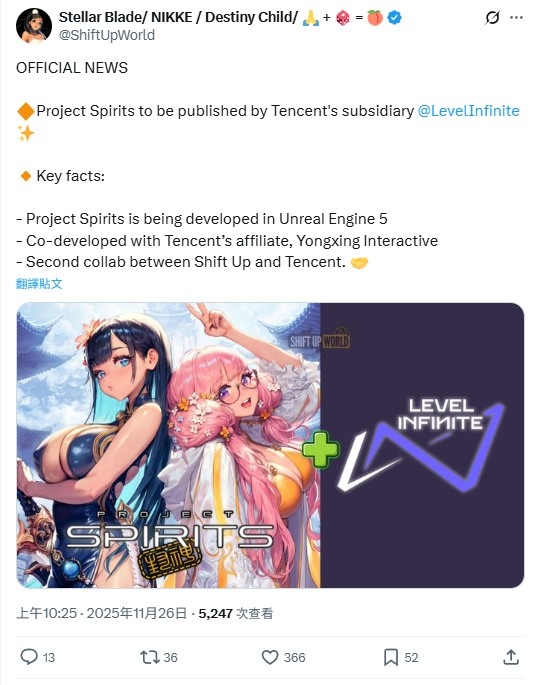 中國騰訊旗下遊戲發行品牌 Level Infinite 宣佈,與韓國 Shift Up 旗下開發中新作《Project Spirits》簽訂全球代理發行合作契約。