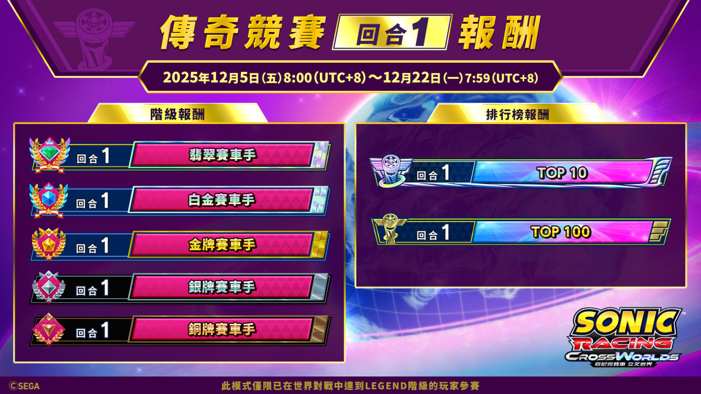SEGA 世雅宣布,好評發售中的《索尼克賽車 交叉世界》,已決定在 2025 年 12 月 5 日(五)於遊戲內舉辦頂尖賽車手專用限期賽事「傳奇競賽」。