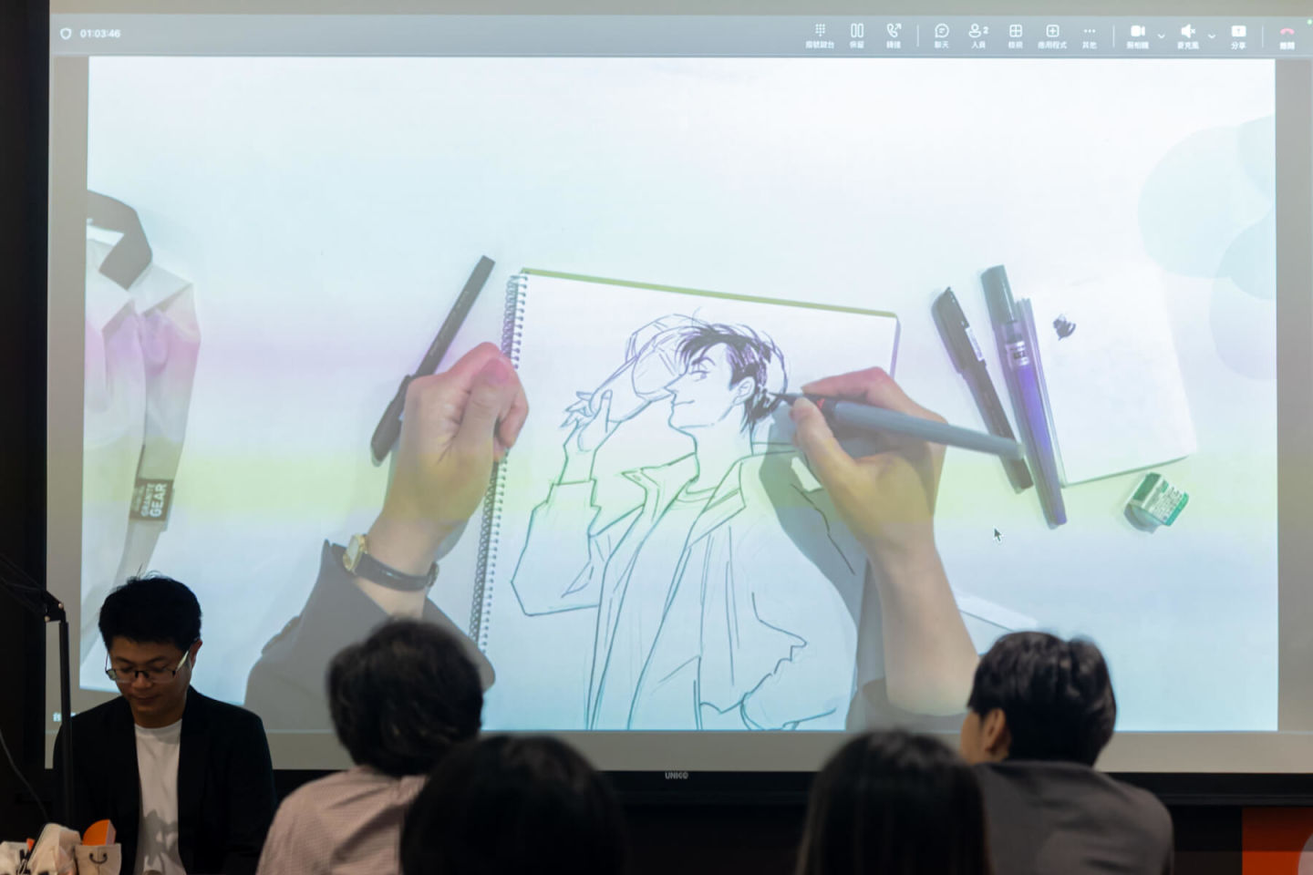 活動上半場,在舒適優雅的輕音樂中邀請兩位老師現場作畫展示,並在大螢幕上投影直播精彩過程,老師們一邊繪圖一邊像跟老朋友們話家常一樣的悠哉閒聊。翻譯分享兩位老師抵達台灣第一天的行程,就是迫不及待先去逛了漫畫書店,興奮地購買了很多本台灣原創漫畫想帶回日本學習參考!