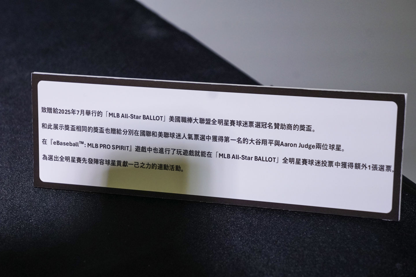 活動現場的一角也低調展示了 KONAMI 與 MLB 官方緊密合作的象徵。現場展出了一座特殊的獎盃,致贈給 2025 年 7 月舉行的「MLB All-Star BALLOT」全明星賽球迷票選冠名贊助商的紀念。這座獎盃的複製品也同樣贈予了在 2025 年國聯與美聯球迷人氣票選中,分別奪下第一名殊榮的大谷翔平與 Aaron Judge 兩位超級巨星。