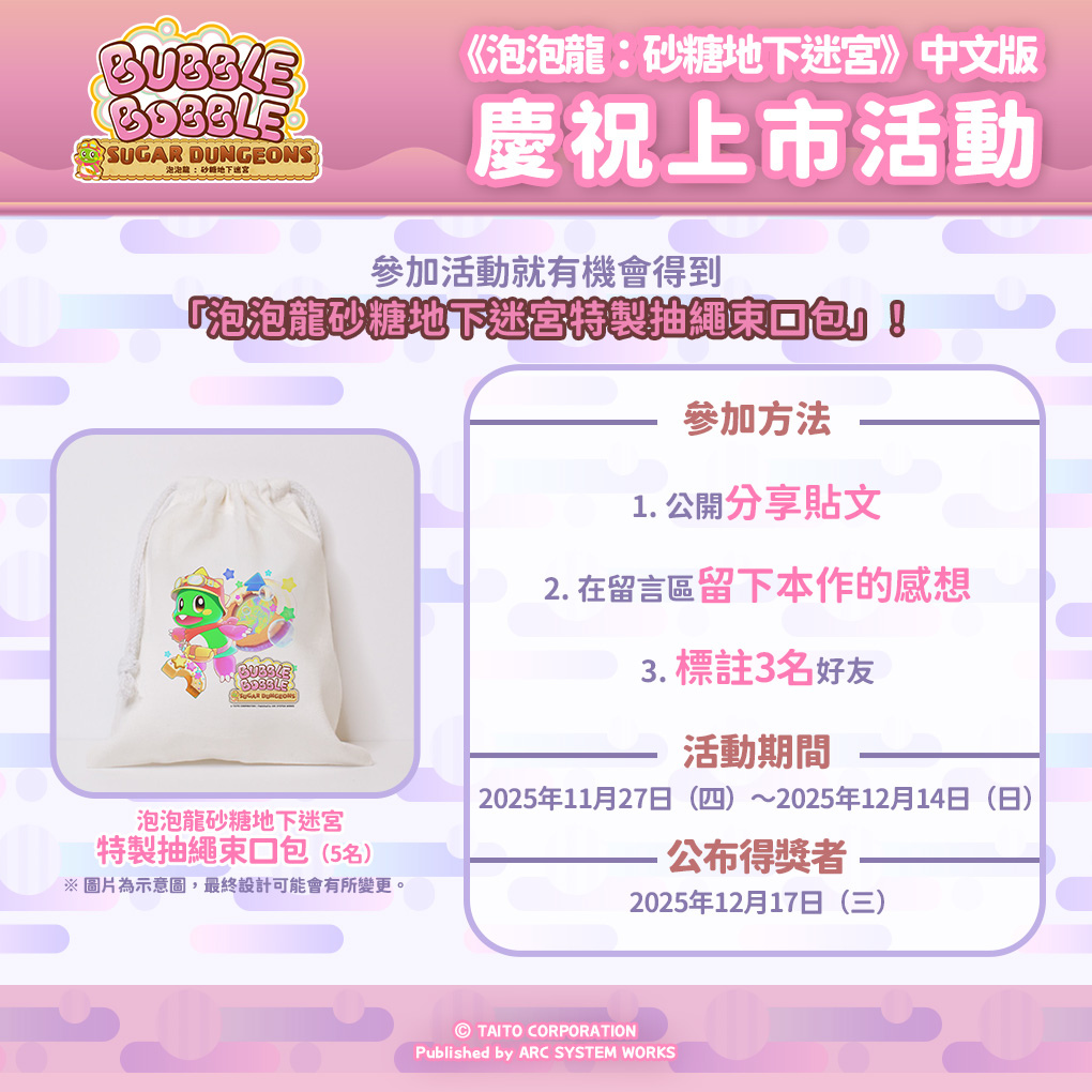 為慶祝《泡泡龍:砂糖地下迷宮》中文版上市,從今天起舉辦抽獎活動。公開分享活動貼文並在留言區留下關於本作的感想,就有機會得到「泡泡龍砂糖地下迷宮特製抽繩束口包」。