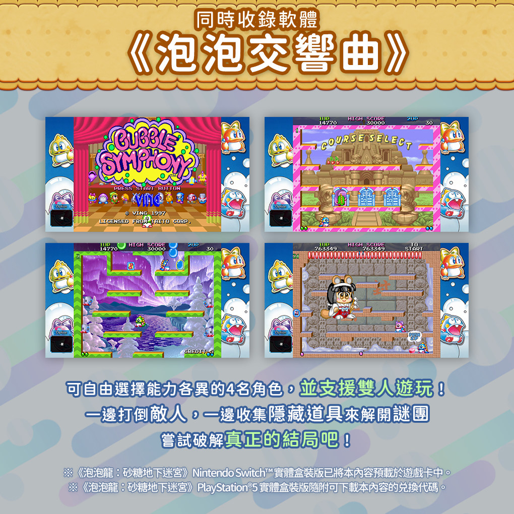 Taito 公司的動作遊戲《泡泡龍:砂糖地下迷宮》中文實體盒裝版(Nintendo Switch、PS5)與數位下載版(Nintendo Switch、PS5、Steam)已於今日(27 日)正式上市。內含數位原聲帶與數位美術集的豪華版也一併發售。