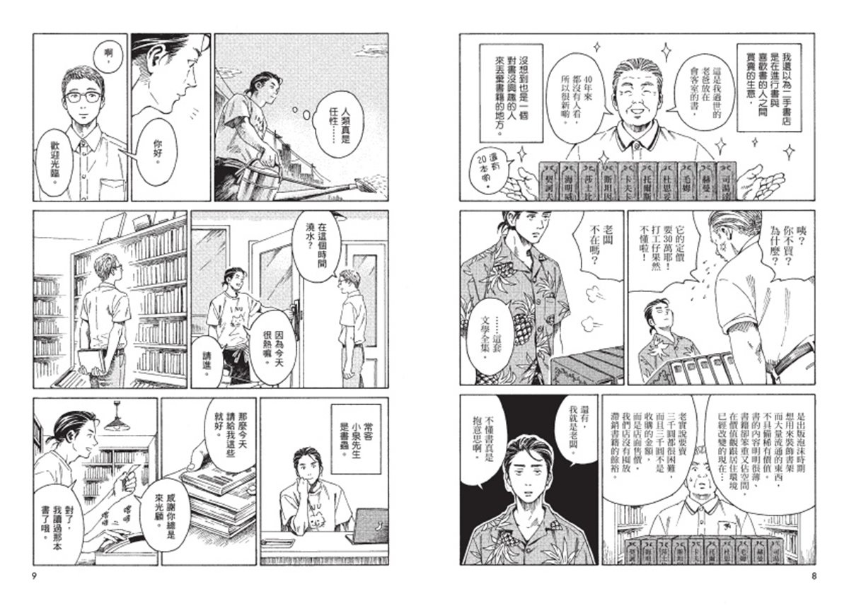 「這是少見能讓愛書人感到被理解的漫畫。古書店作為場域,產生了「時間感」與「承接」的氛圍。書的保存、被放棄、被購買、再次被閱讀。於此中,時間、遺留、流轉的感覺被觸及。最後留在心裡的,不只是書的內容,還有那個『仍熱愛閱讀的自己』。」──安博(資深愛書人、文化專欄作家)