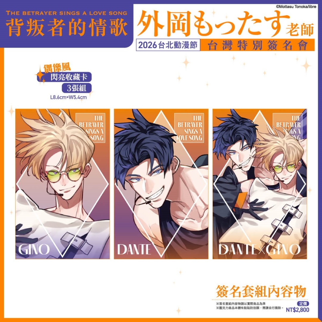 .參加辦法:2025年12月29日(一)10:00~2026年1月5日(一)12:00,至台灣角川官網活動頁面所提供之【問券表單】登記抽選《背叛者的情歌》簽名會套組(2026台北國際動漫節會場)購買資格(限額120名),中選者將個別寄發通知信函提供【購買連結】,每人限購一組「《背叛者的情歌》簽名套組」(售價2,800元),活動當天請攜帶「活動邀請函」及「本人身分證正本」,至2026台北國際動漫節南港展覽館,交由舞台指定排隊區工作人員驗證身分後排隊入場。