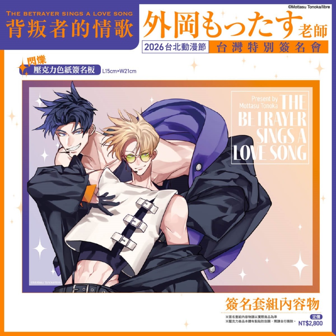 2026台北國際動漫節即將於明年盛大登場,台灣角川今日正式公布本屆重點舞台活動情報──超人氣黑手黨戀愛 BL 漫畫《背叛者的情歌》作者外岡もったす 老師將首度來台舉辦特別簽名會。這是作者首次與台灣讀者近距離交流,現場將深入分享創作歷程與趣聞、人氣角色們的設定靈感並獨家揭露故事發展!
