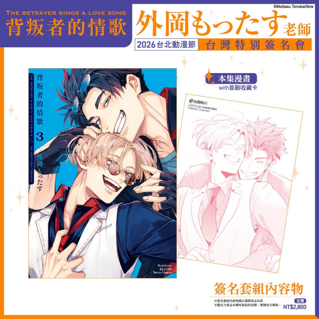 活動將於 2026 年 2 月 6 日(五)在動漫節會場及安利美特台北店盛大舉辦,有興趣的讀者朋友們請把握難得機會!《背叛者的情歌》簽名資格套組將在 12 月底於台灣角川官網開放登記抽選,全台僅限量 220 組的購買資格,詳細辦法請至官網或粉絲團查詢。