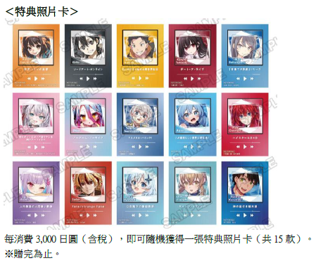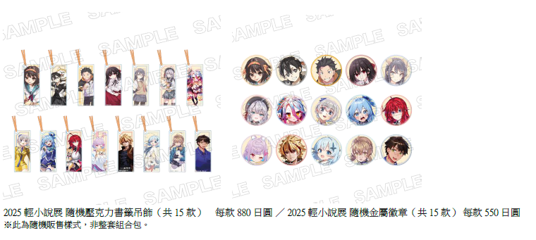 為「2025 輕小說展」特別創作的全新插圖,將化身為 150 款以上新周邊商品供各位選購,現場亦同步販售輕小說相關的書籍以及歷年人氣與新作商品。另外,每消費滿 3,000 日圓(含稅),即可隨機獲得一張採用「2025 輕小說展」全新插圖製作的「迷你照片卡」(共 15 款)。