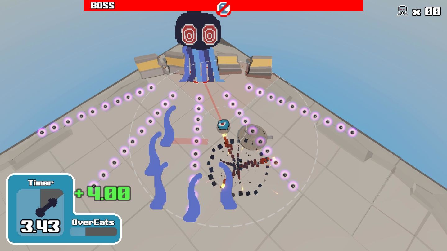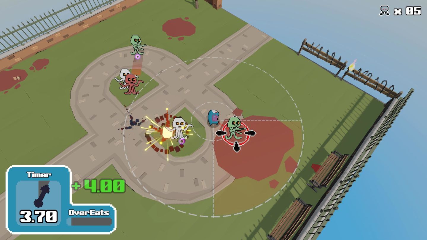 但是,作為人類最後希望的 42 號因為過於強大,能量消耗也極其巨大。必須不斷捕食外星人攝取卡路里。其活動時間竟然只有 4 秒……!除了衝刺和撞擊等動作,還可以利用在饑餓瀕死時捕食觸發的「Just Eats」和飽腹時的無敵模式「Over Eats」,爽快地達成「完食」目標吧。