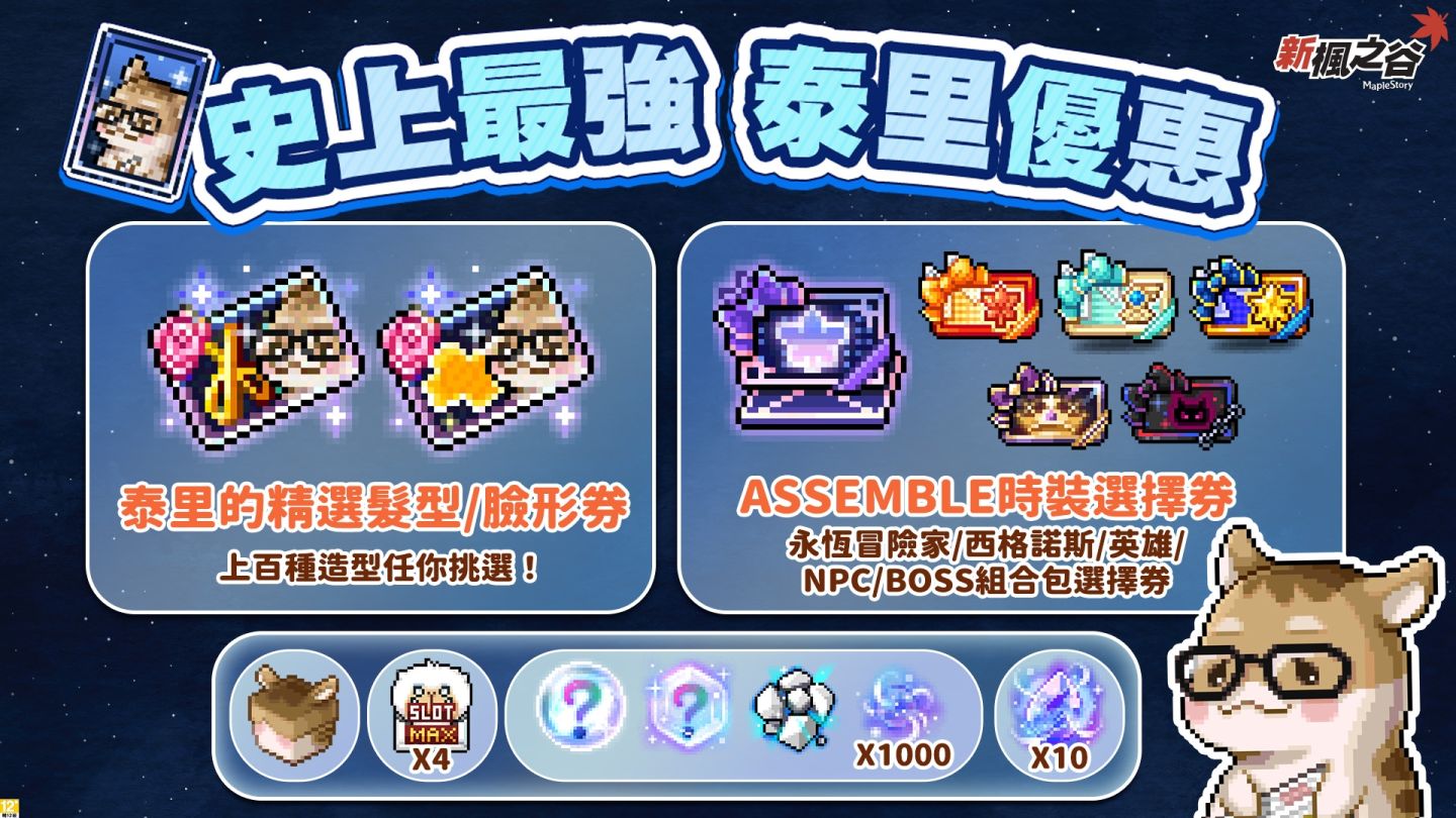 官方祭出史上最強改版禮包,包括首次亮相的「泰里的精選髮型券與整形券」與「永恆冒險家、西格諾斯、英雄、NPC 及 Boss 組合包選擇券」,並提供多項成長道具。其中「泰里的精選髮型券與整形券」開放百款造型任選,獎勵幅度堪稱史無前例。玩家自今(29)日晚間六點至 2026 年 4 月 7 日於遊戲商城輸入序號「MAPLESTORYASSEMBLE」即可領取。