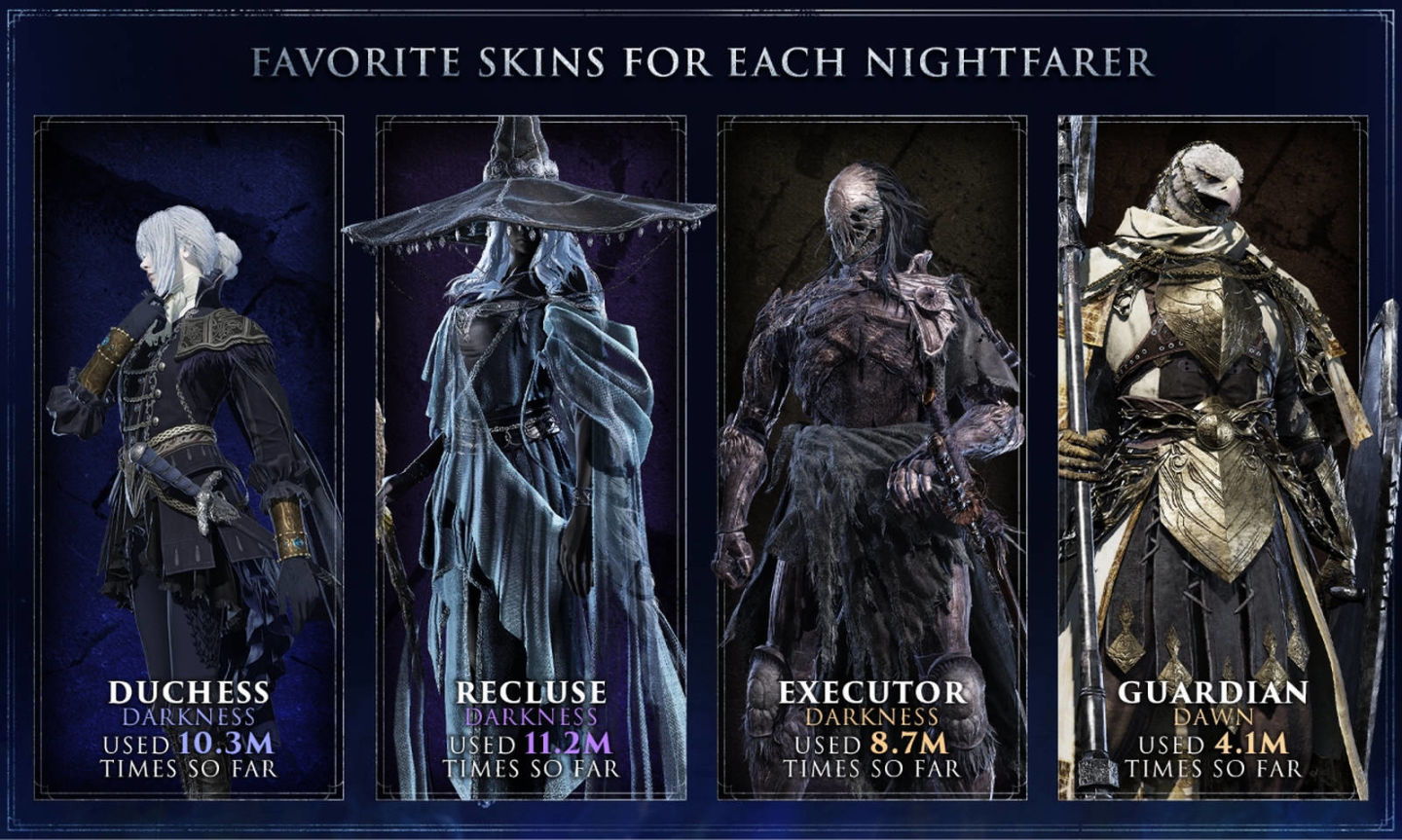 至於在各渡夜者的使用方面,遊戲中雖然有「追蹤者/處刑者/復仇者/守護者/女爵/隱士/鐵之眼/無賴」等渡夜者可供選擇,但在使用頻率上,以女爵、復仇者與隱士等女性角色的暗黑外觀使用頻率較高。另外追蹤者以《黑暗靈魂》登場騎士亞爾特留斯為主題設計的「漫步深淵」外觀則是目前最受歡迎的外觀。
