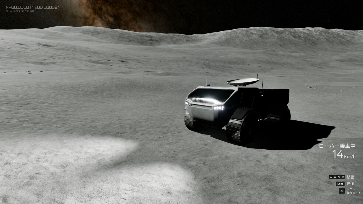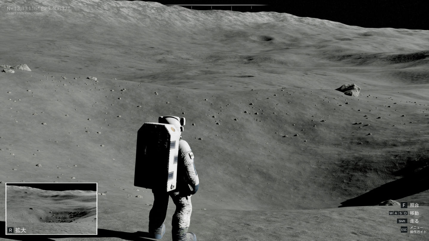 在遊戲中,玩家將可以在這個藉由科學基礎(如每個時間太陽/地球/月亮位置關係等等)與各種 DEM 地形高低等資料真實重現的月面舞台上自由探索冒險,體驗身為太空員在月面漫步的獨特體驗。
