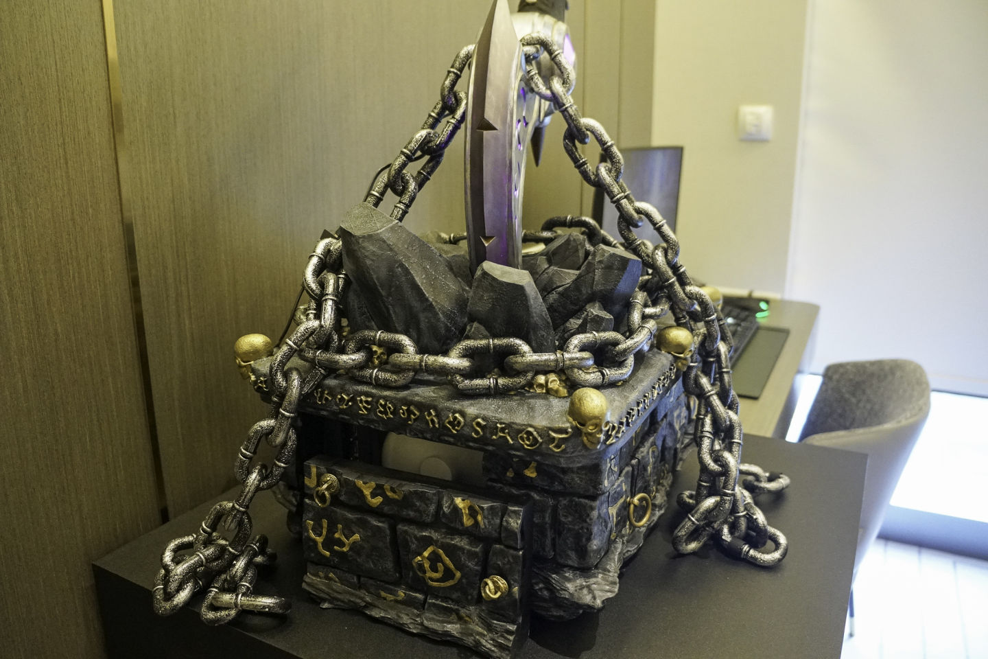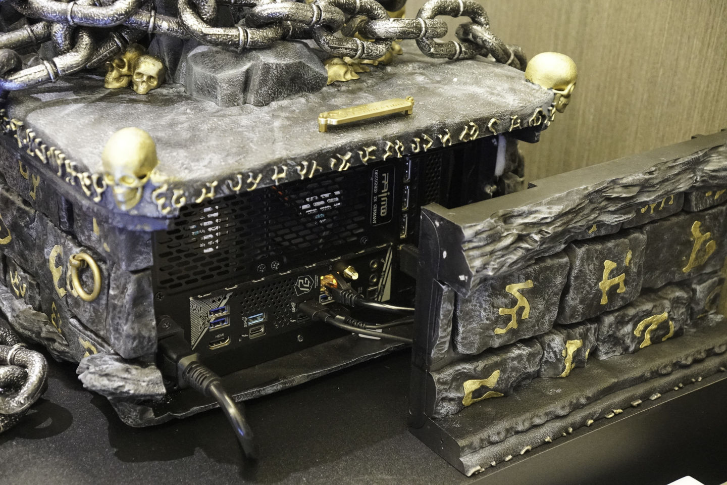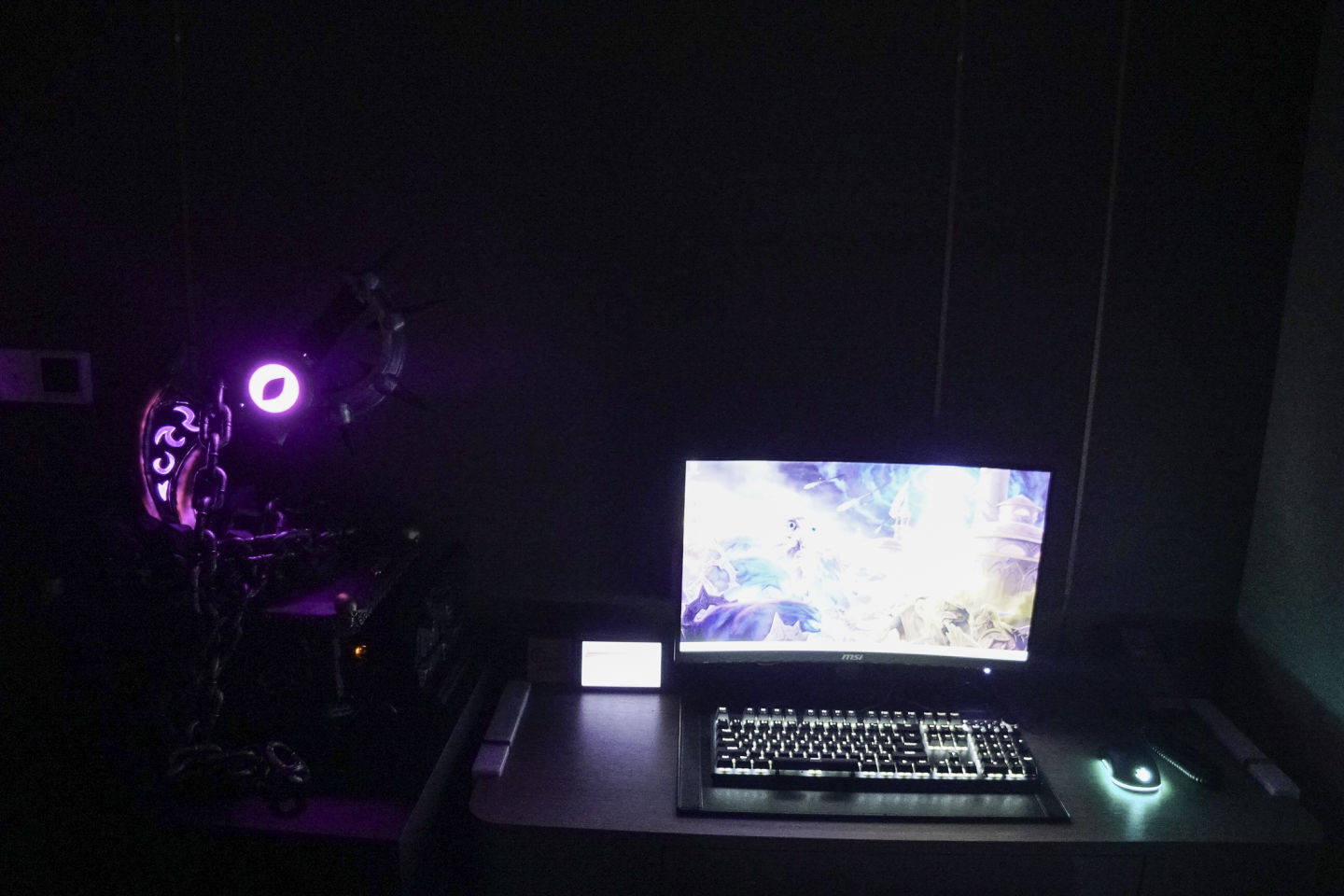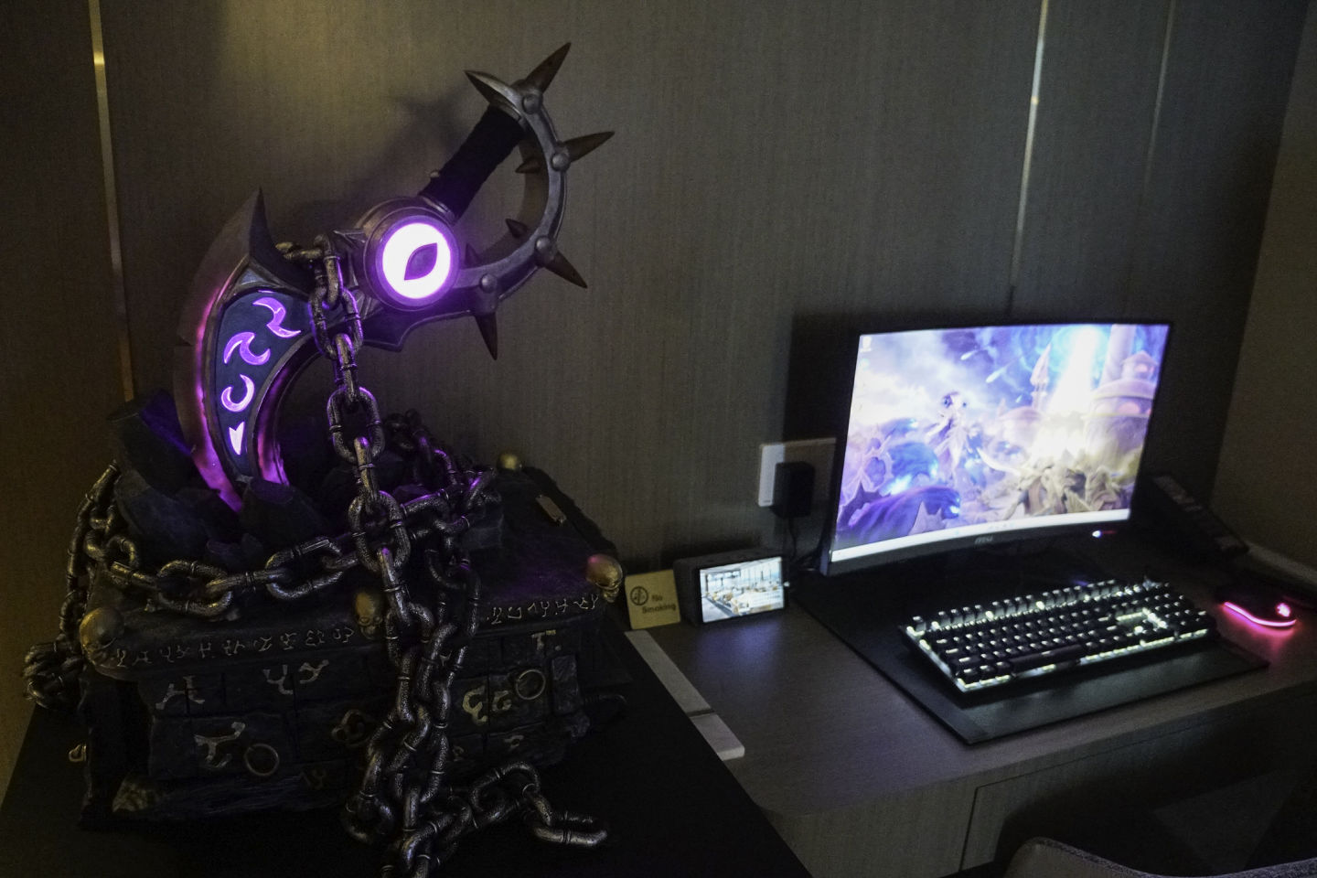 對於組裝 PC 硬體玩家來說,房內最吸睛的設備莫過於一台由台灣知名電腦改裝職人 Mark's Fabrication 獨家打造的客製化主機。這台 60 公分的 PC 以「薩拉塔斯.黑暗帝國」為主題,將虛空美學實體化,屆時別忘了關燈一睹黑暗魔力的光芒。