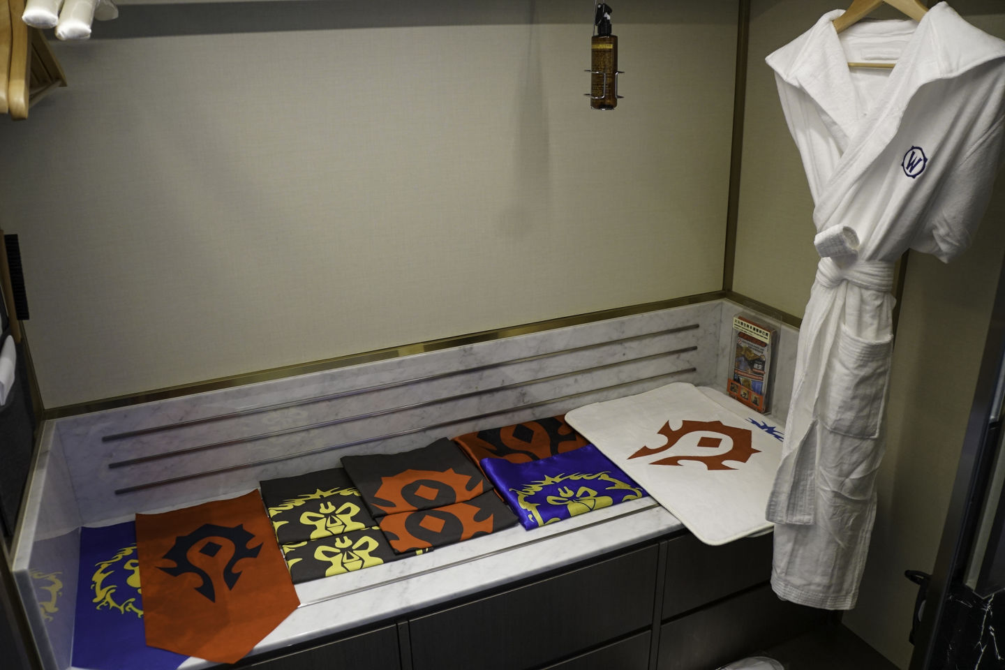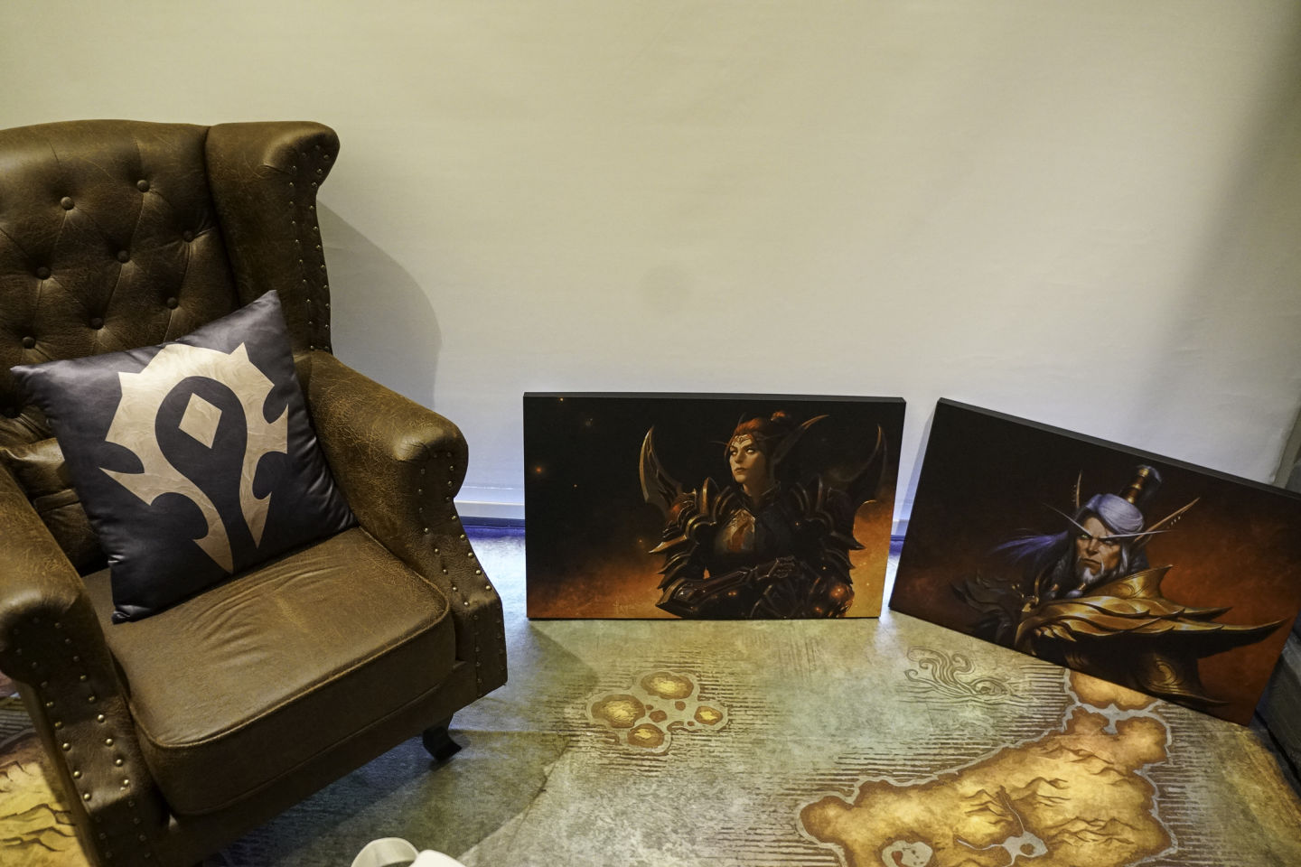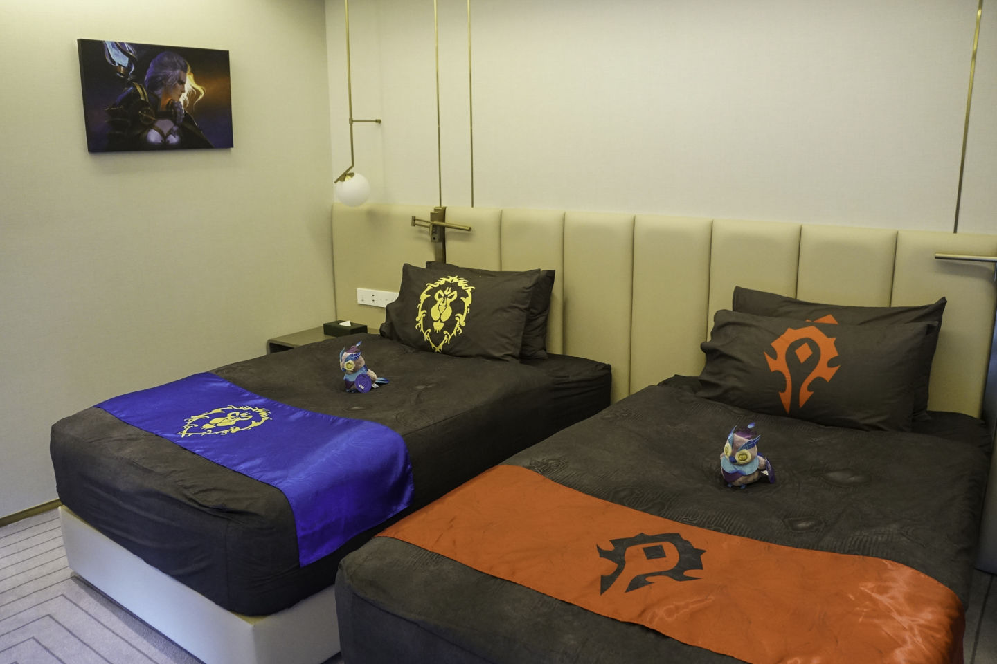 更有趣的是,住客可以親自動手替換牆上的經典角色壁畫,甚至更換象徵部落或聯盟的旗幟床飾,可呼應遊戲內房屋系統強調的「自定義」特色。