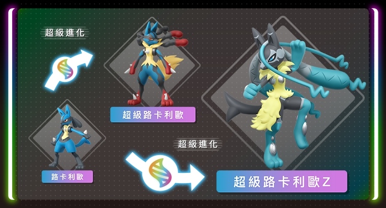 路卡利歐超級進化後的樣子「超級路卡利歐」已於《寶可夢傳說 Z-A》登場,而在《寶可夢傳說 Z-A 超次元爆湧》中,將會有新發現的「超級路卡利歐 Z」登場。像超級路卡利歐 Z 這樣,牠們從接受指示到出招為止的累積時間會變短。相對地,超級能會消耗得很兇,不適合長期戰,因此應儘早分出勝負。