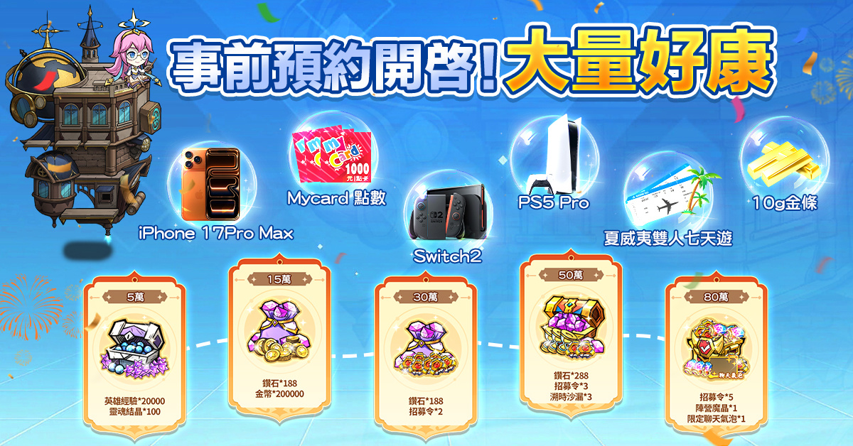 官方表示,在開服的時候將持續本次事前預約活動福利加碼,誠意滿點!參與事前預約還將有機會抽中重量級大獎:iPhone 17 Pro Max、MyCard 點數、Switch 2、PS5 Pro,以及終極大獎——夏威夷雙人七天遊和 10g 金條!感興趣的玩家千萬別錯過,趕緊鎖定《堡壘傳說:蒸汽龐克》官方粉絲團,後續還將解鎖更多精彩活動與獨家好康。