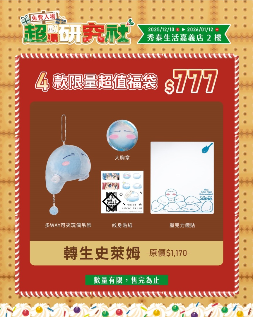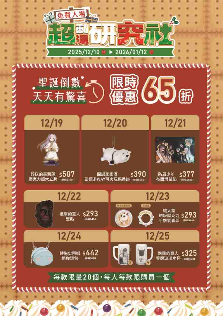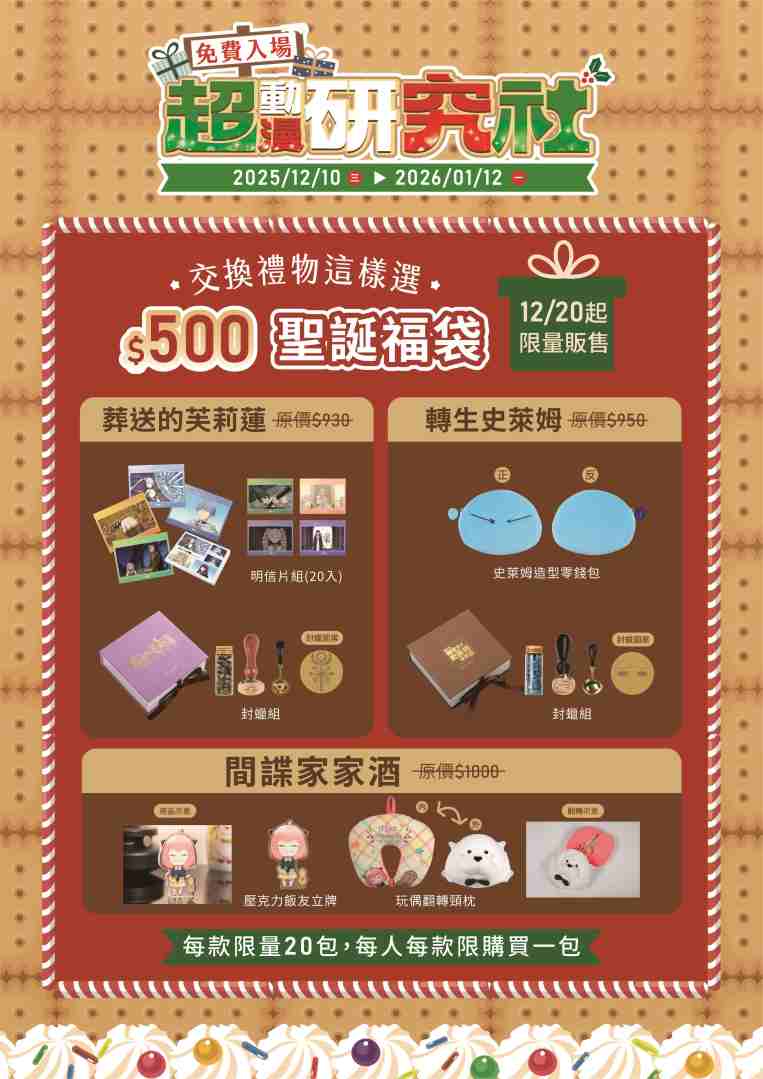 歡慶聖誕倒數優惠,12 月 19 日~12 月 25 日每日推出限定商品優惠 65 折(每日限量 20 個,每人限購一個)。12 月 20 日起推出 500 元聖誕福袋,交換禮物輕鬆搞定,《葬送的芙莉蓮》福袋內含封蠟印章組、經典場景明信片組;《轉生史萊姆》福袋則有封蠟印章組、超可愛的史萊姆造型零錢包、《SPY×FAMILY 間諜家家酒》福袋有彭德兩用翻轉頸枕、壓克力飯友立牌。
