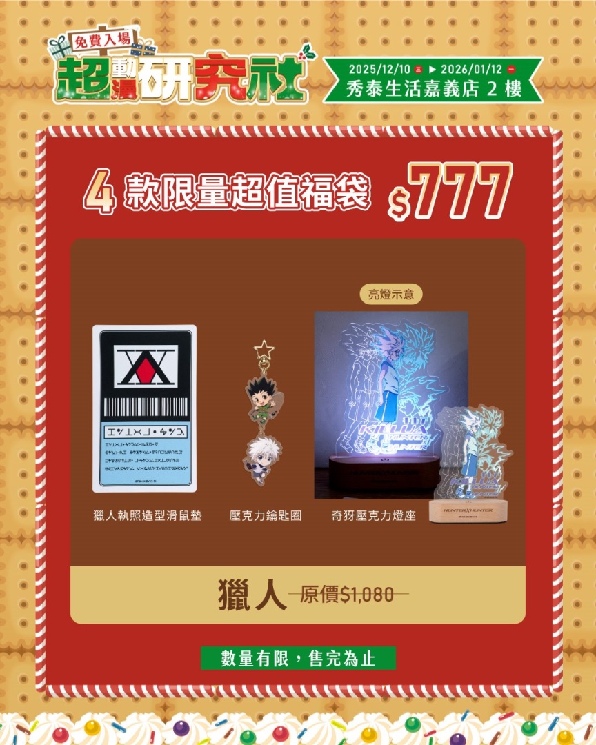 「超動漫研究社」快閃店推出四款大人氣作品限量福袋,內含多款精選實用周邊與收藏商品,粉絲不可錯過。《獵人HUNTER×HUNTER》福袋內含奇犽燈光壓克力燈座、獵人執照造型滑鼠墊,以及小傑與奇犽垂墜式鑰匙圈。《葬送的芙莉蓮》福袋則包含金屬證件套、雙面全彩抱枕套、壓克力鑰匙圈及芙莉蓮寶箱怪搖搖馬。《SPY×FAMILY 間諜家家酒》福袋內有花生零食袋抱枕、彭德玩偶吊飾,以及經典場景圖撲克牌。《轉生史萊姆》福袋則帶來超可愛史萊姆鏡貼、多功能可夾玩偶吊飾、紋身貼紙及大胸章。