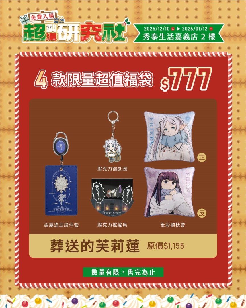 今年冬天,木棉花為粉絲獻上最暖心的動漫年末盛典!「超動漫研究社」快閃店 2025 年 12 月 10 日至 2026 年 1 月 12 日於嘉義秀泰影城 2 樓盛大登場。集結四大人氣動畫《葬送的芙莉蓮》、《進擊的巨人》、《SPY×FAMILY間諜家家酒》、《膽大黨》打造合影造景區、限量福袋、滿額贈與多重優惠好禮,陪伴粉絲度過充滿驚喜的聖誕與新年假期。
