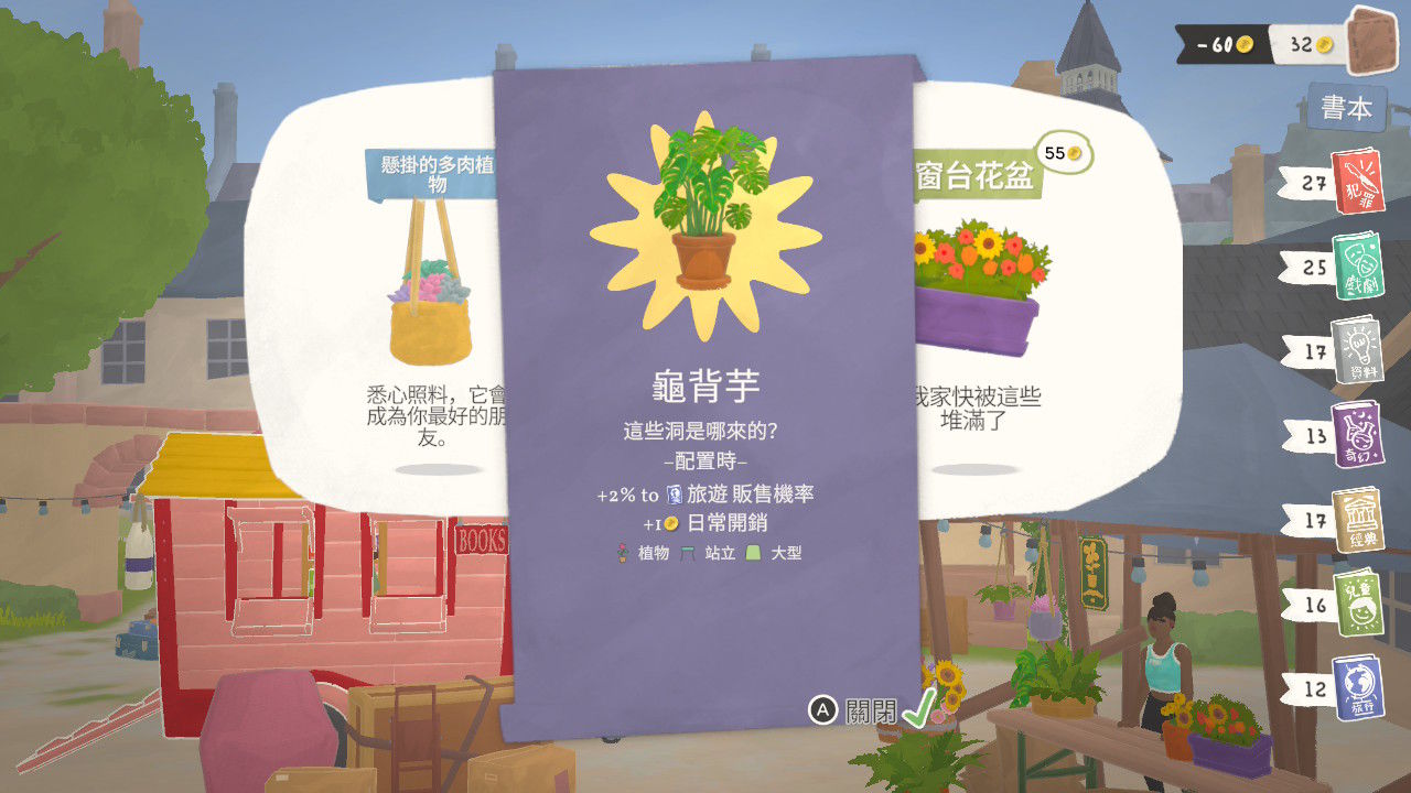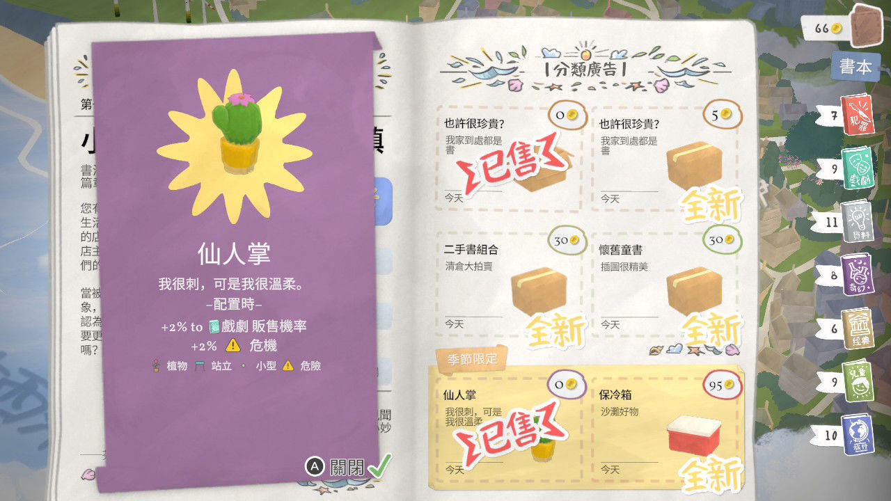 裝飾移動書攤,陳列旅途中獲得的收藏,通過不同的裝修風格影響顧客的心情和購買偏好。造訪地圖上的各個地點,根據每個地區顧客的喜好,靈活調整書籍陳列策略。