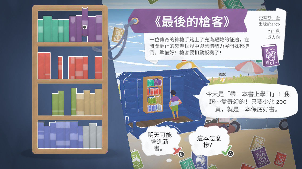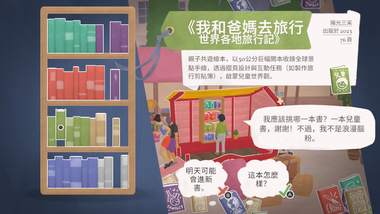 有時,猶豫不決的顧客會向你尋求幫助,在溝通中了解顧客的偏好,用一本精心挑選的好書,點燃他們的閱讀興趣。遊戲內還特別加入了中文精選書單,讓你在遊玩時,也能邂逅那些既熟悉又充滿驚喜的文學佳作。