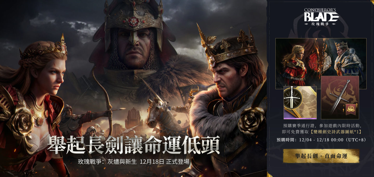 《戰意 Conqueror's Blade》預定於 12 月 18 日推出不列顛賽季「玫瑰戰爭」,並同步登場全新武器「變種劍」。更多新賽季相關情報與活動內容,敬請持續關注官方後續公告。