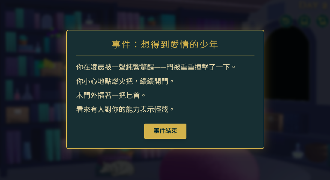 結合劇情敘事、藥草調配與選擇導向玩法的原創視覺小說遊戲。玩家將扮演一名擁有藥草知識的中世紀平凡人物,隨著名聲在口耳相傳中逐漸擴散,越來越多人前來求取藥方。然而,在看似單純的請求背後,也暗藏著不同的意圖與危機,有的是恐怖情人想向對象下蠱,有的是受家暴的婦女尋藥解決問題,你的每一次調配與選擇,都將影響故事的走向。遊戲流程約為 5 至 10 分鐘,依據玩家的抉擇發展出四種不同結局,呈現信任、懷疑與命運交錯的多重面貌。