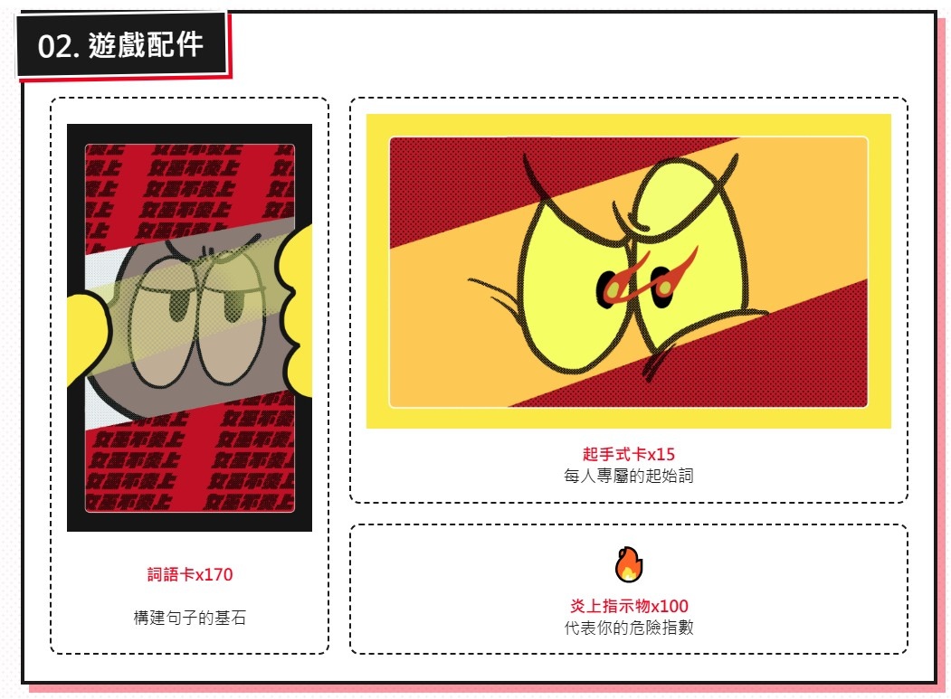 以網路炎上文化為核心概念的派對型卡牌遊戲。玩家透過組合爭議語句,在流量與被炎上之間斟酌詞語,嘗試精準「控火」,創造出類似於《黃牌》、《地獄列車》的地獄級黑色幽默。在這場充滿嘴砲的言語攻防中,玩家的目標不是成為最清白的人,也不是最惡名昭彰的焦點,而是巧妙遊走在危險邊緣,精準掌控炎上的熱度,在混亂之中存活到最後。