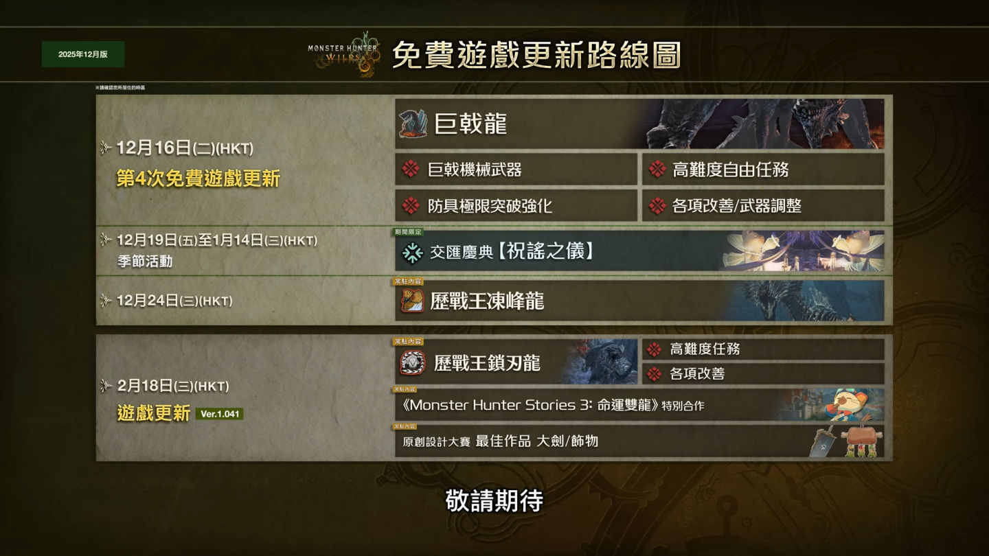 Capcom 正式公開了《魔物獵人:荒野》(Monster Hunter Wilds)直至 2026 年初的最終更新路徑圖。官方確認即將於 12 月 16 日上線的「免費大型更新第四彈(TU4)」,將是本作最後一次追加全新魔物的大型改版,重心將轉向系統最佳化。