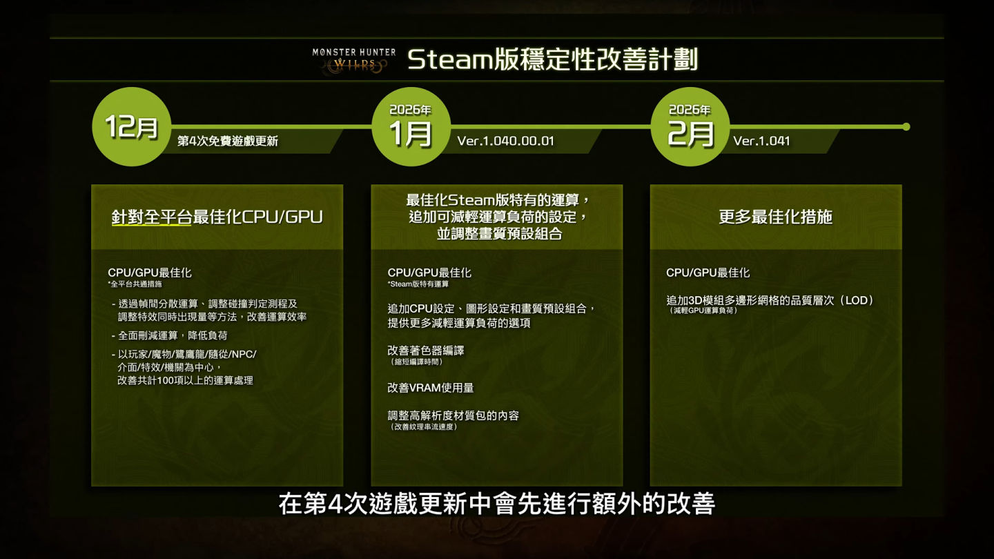對於 Steam 版官方終於針對「效能與最佳化化」給出了具體承諾。鑑於部分玩家反饋更新後負載增加的問題,開發團隊制定了橫跨三個月的修復計畫。首先,12 月 16 日的 TU4 更新將針對所有平台進行 CPU 與 GPU 的底層最佳化,並特別改善 Steam 版的處理時間與負載。