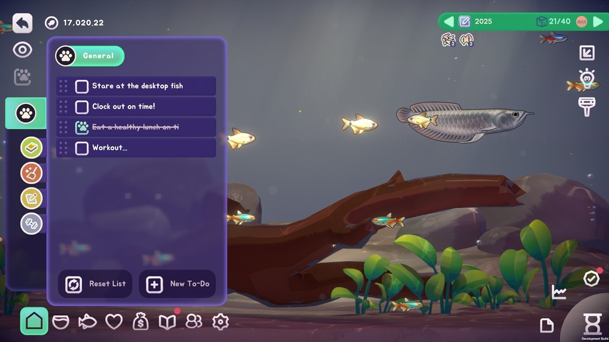 - 多采多姿的魚缸-「吾獨愛魚!」:首發將收錄超過 100 種不同形態的魚,並可在遊戲內百科圖鑑 中探索更多趣味知識。餵魚兒,見證它們成長;用造景物件美化水族箱,既為魚兒豐容,也為你的專注體驗增添色彩;還能繁殖獨特的珍貴魚種,為你的收藏帶來驚喜!