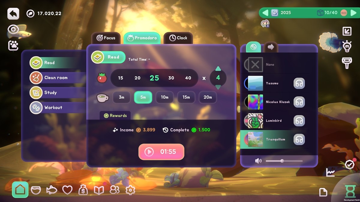 《魚我一起:水癒時光》是一款透過虛擬養魚體驗幫助提升專注力的遊戲化工具。遊戲背景設置在寧靜的水族箱環境中,魚兒悠然遊動、流水潺潺,搭配舒緩的音樂與白噪音,營造放鬆的氛圍,幫助玩家輕鬆進入“心流”狀態。透過完成專注目標獲得的獎勵,玩家可以收集、餵養並繁殖多種魚類,並打造自己專屬的自訂水族箱。