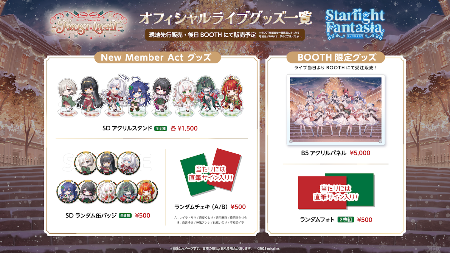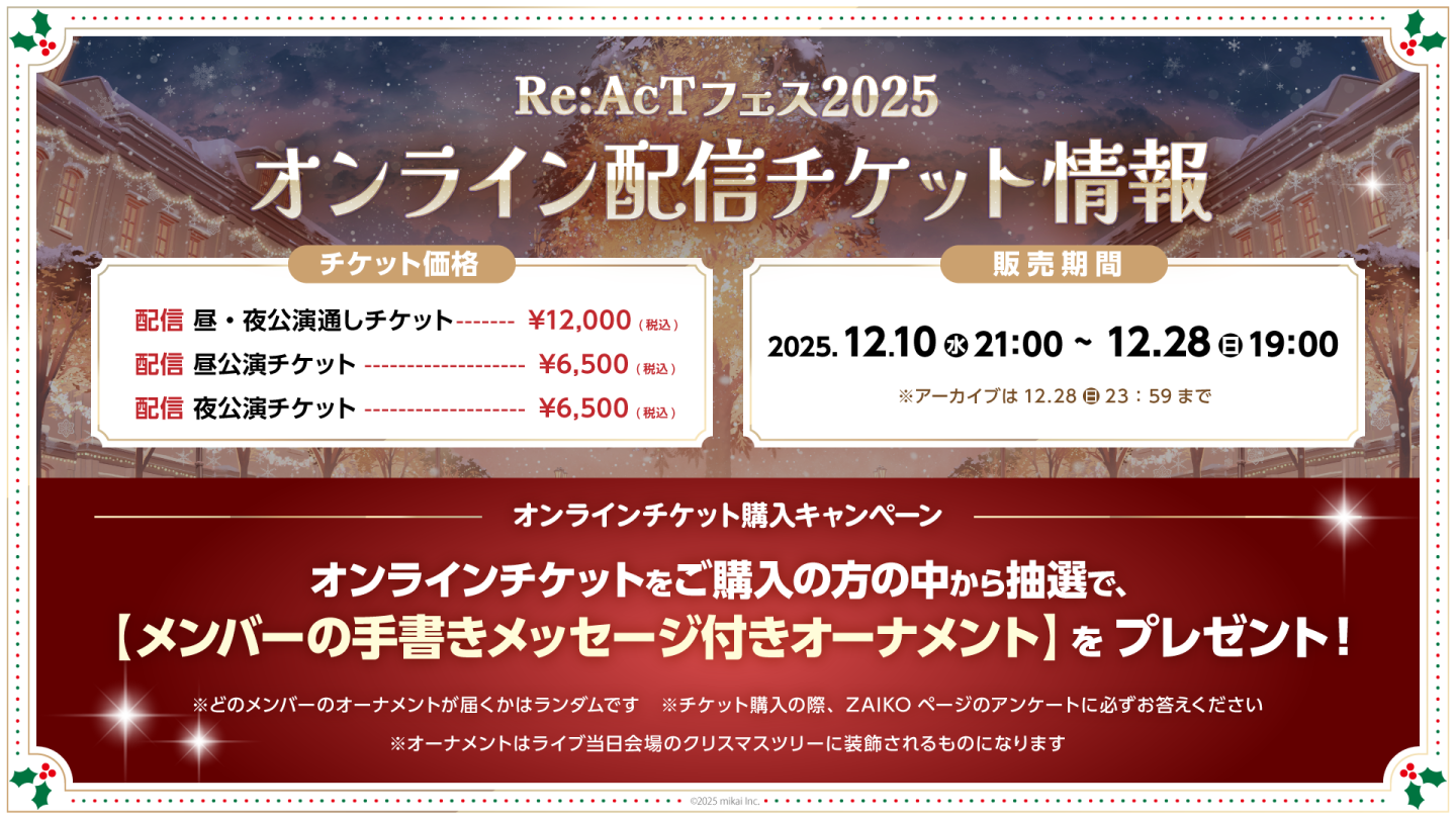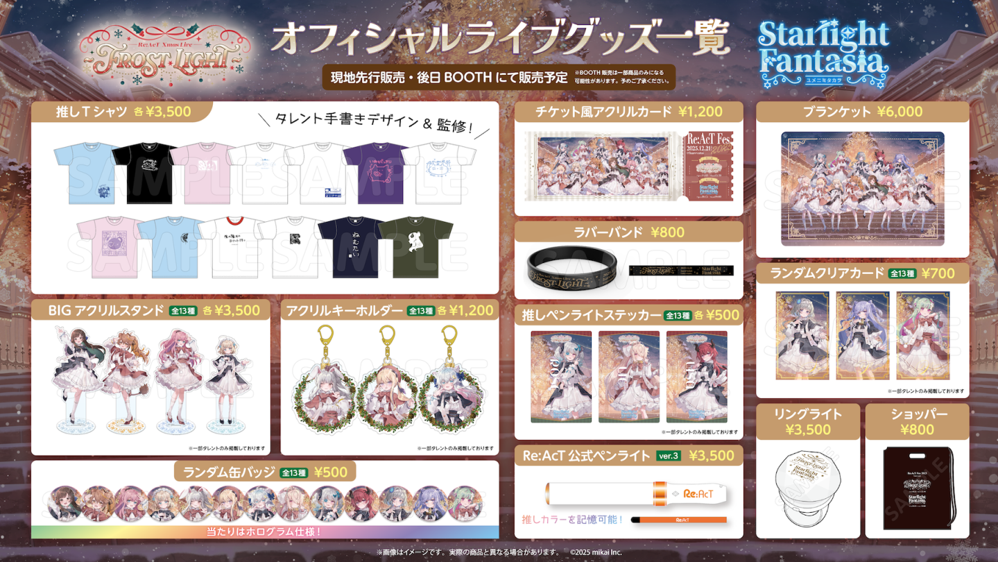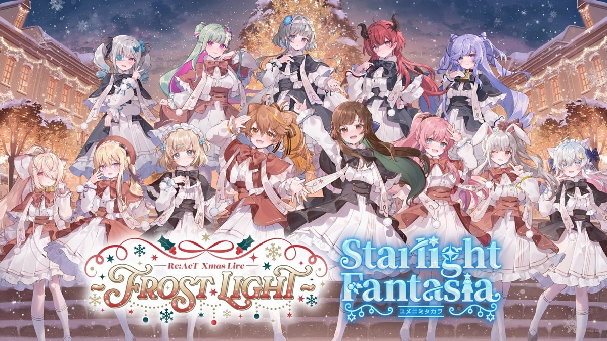 日場「Re:AcT Xmas Live 〜Frost Light〜」以「Merry Christmas」為主題,將獻上多首翻唱曲與聖誕氛圍滿載的華麗演出;夜場「ユメニミタカラ〜Starlight Fantasia〜(夢幻寶盒~星光幻想曲~)」則聚焦 Re:AcT 原創歌曲,並獻上虛擬主播成員間的洗牌(Shuffle)演唱,對粉絲們而言是難得一見的特別企劃。會場將設置聖誕樹主題拍照區作為亮點展示,聖誕樹上還會繫上主播們親筆留言的聖誕掛飾。