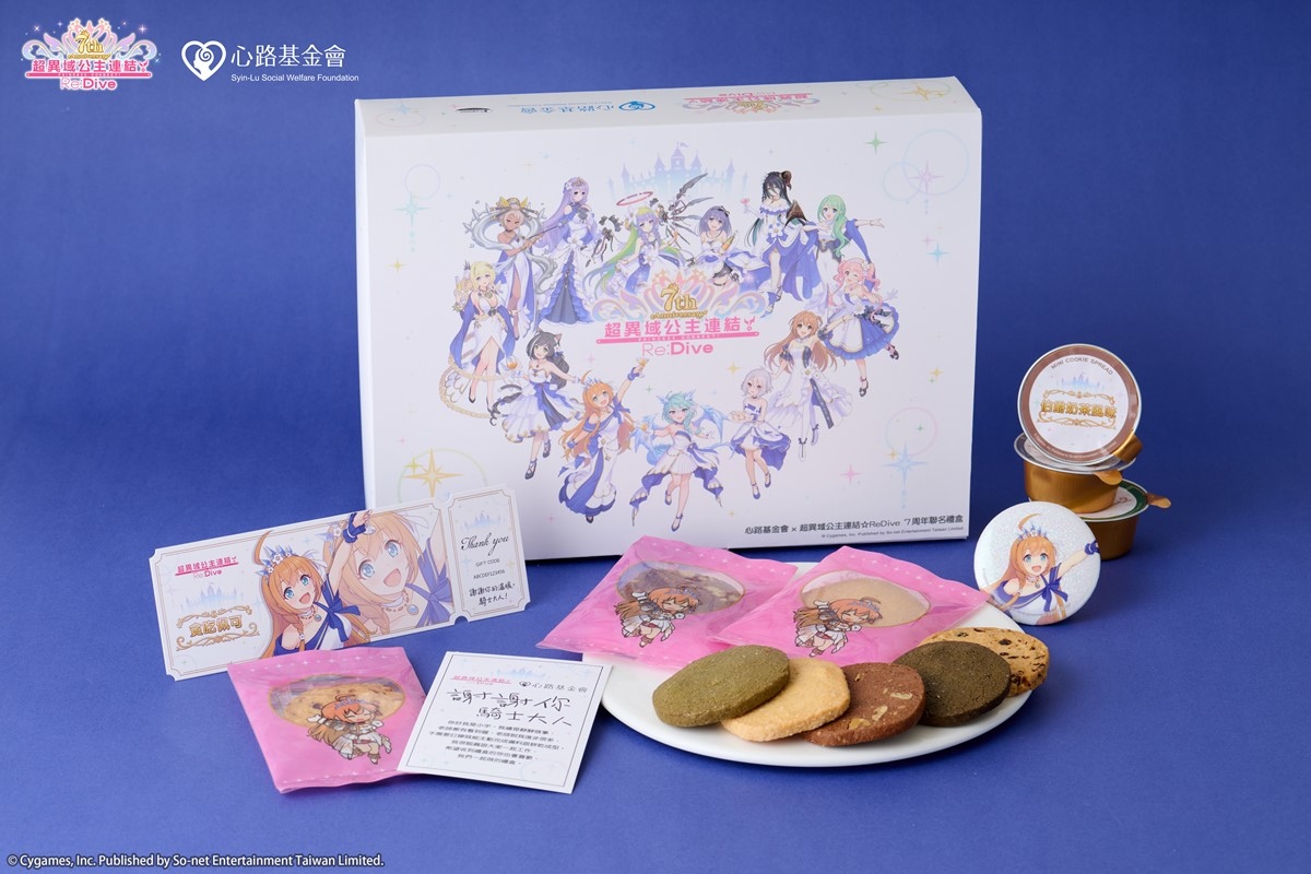 《公主連結R》與心路基金會聯名禮盒選用 7 周年晚宴主題形象設計,除獨特的服裝之外,也敬邀玩家們一同參與這場公益活動。每盒禮盒都包含了由心路庇護工場青年手工製作的餅乾與嚴選抹醬,如同遊戲內晚宴上的茶點餅乾;並附上隨機公主款式的聯名胸章、邀請卡(虛寶卡)與飽含心意的聯名感謝卡,值得玩家珍藏!另外,遊戲中也同時舉辦如登入獎勵活動與1日1回免費10連轉蛋等豐富活動,邀請大家不論線上線下都能繼續一同前進!