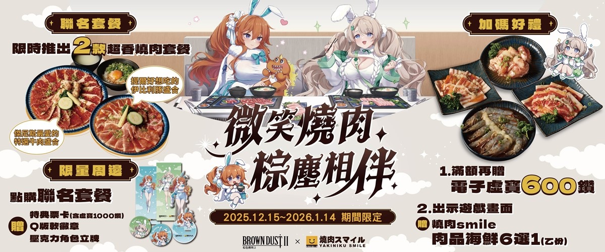 凡購買聯名套餐即可獲得角色插卡、特典虛寶卡(含虛寶序號 1,000鑽)、Q 版軟徽章、壓克力角色雙風格立牌組(立繪+Q 版)等多項周邊好禮;活動期間出示《棕色塵埃2》遊戲畫面,還能享有菜品 6 選 1 的加碼優惠(單筆消費限贈乙份)。此次合作特別安排了南、北兩間主題店舖,玩家能盡情地拍照打卡,活動期間為:2025/12/15(ㄧ)- 2026/01/14(三)。