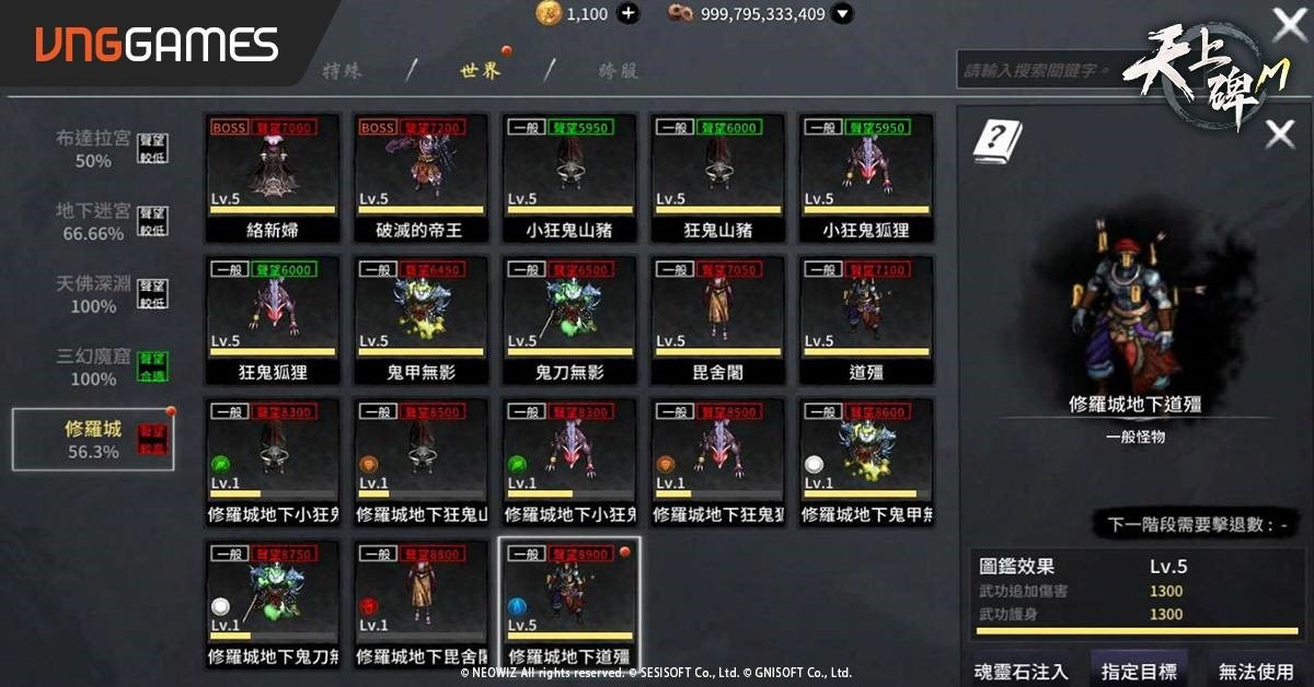 關於此次全新挑戰地區「修羅城地下」開放,玩家可透過於修羅城內擊殺怪物時掉落的「修羅城地下瞬間移動符」前往該區域。玩家進入「修羅城地下」後,將可蒐集包含一般怪物在內的共 8 種全新專屬狩獵圖鑑,完成蒐集除可提升四維屬性數值(力量、外功、敏捷、熟練),還能獲得 PVP / PVE 傷害、基本攻擊力、暴擊率、武功追加傷害與護身能力等實用屬性,全面強化玩家的探索效率與戰鬥實力。