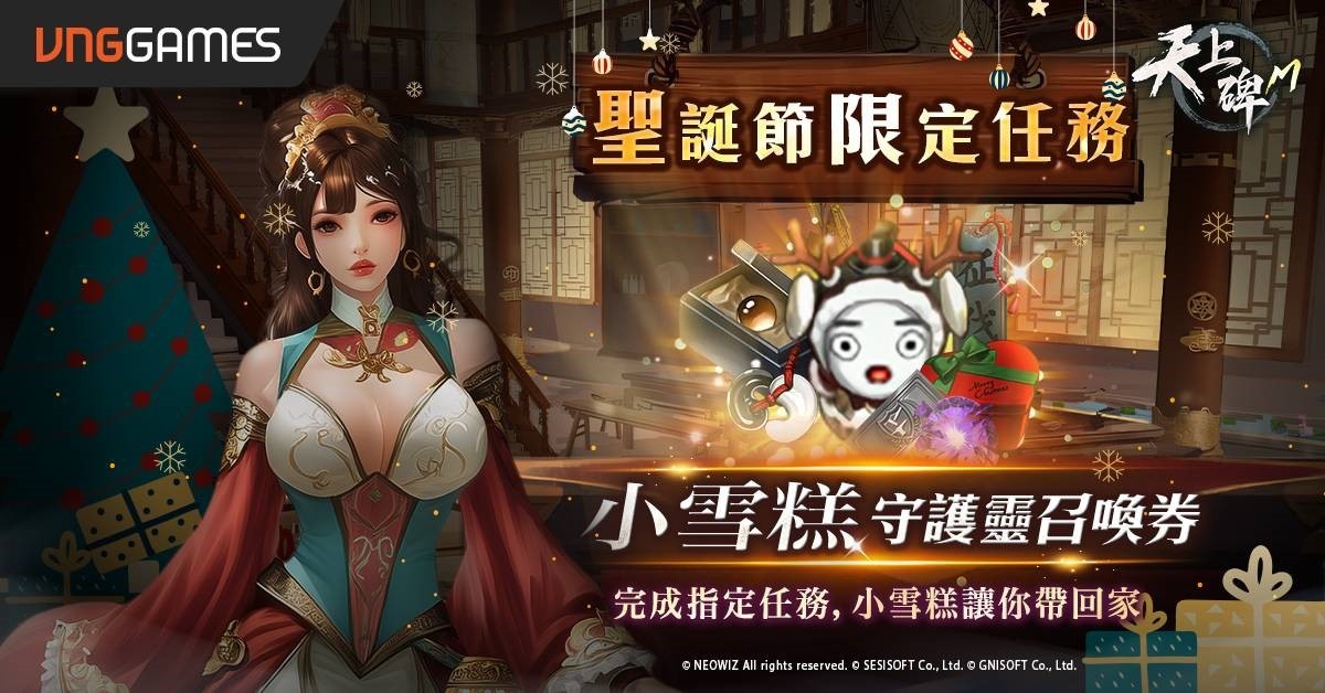 為慶祝聖誕佳節,《天上碑M》官方推出「月女的聖誕七日任務活動」,活動期間每日完成限時任務,即可獲得高價值限定獎勵,其中包含「小雪糕守護靈專屬召喚券(復刻)*1」、「開化神丹*5」、「特殊超越石*1」、「聖誕老人禮物箱*1」等。也將同步開放聖誕節特殊副本,於該副本中怪物掉落率提升 1.5 倍,且有機率掉落「聖誕糖果武器箱」。開啟即可隨機獲得「聖誕糖果玩具刀」或「聖誕糖果玩具槍」,強化至指定等級後,登錄於活動圖鑑中能為角色獲得永久能力加成,最高可提升追加傷害 1% ,讓玩家在聖誕節期間盡享節慶氛圍樂趣與實質戰力提升。